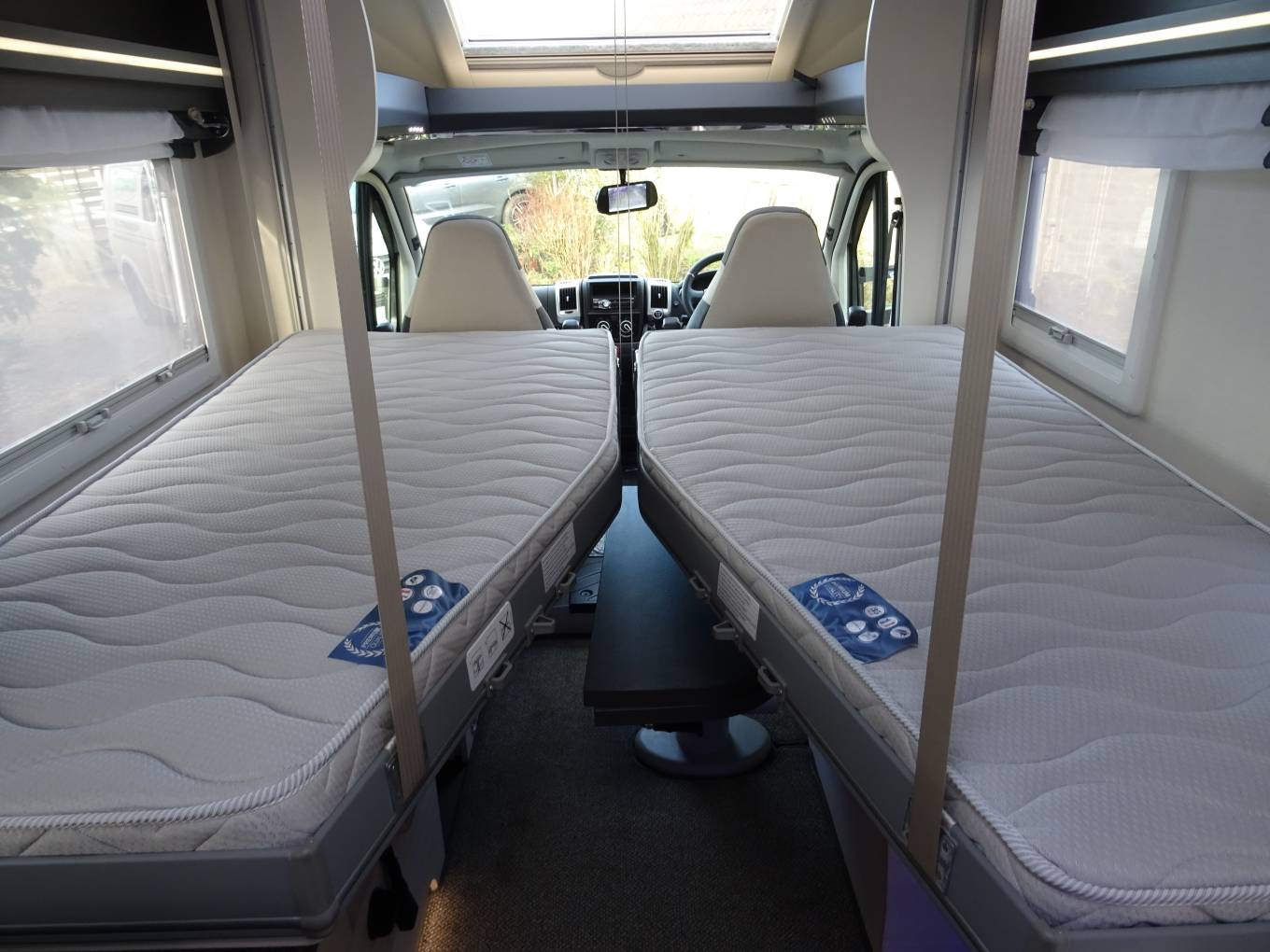 Based on the Fiat chassis with a sought after internal layout, this 2020 motorhome has only covered 850 miles from new. Chausson are renown for their innovation and this vehicle is no exception benefitting from a large lounge area that would easily seat 6 people, a large and well equipped washroom, separate shower with access to the heated garage and electric drop down single beds that with the push of a button disappear into the ceiling, leaving a very spacious and light living area.