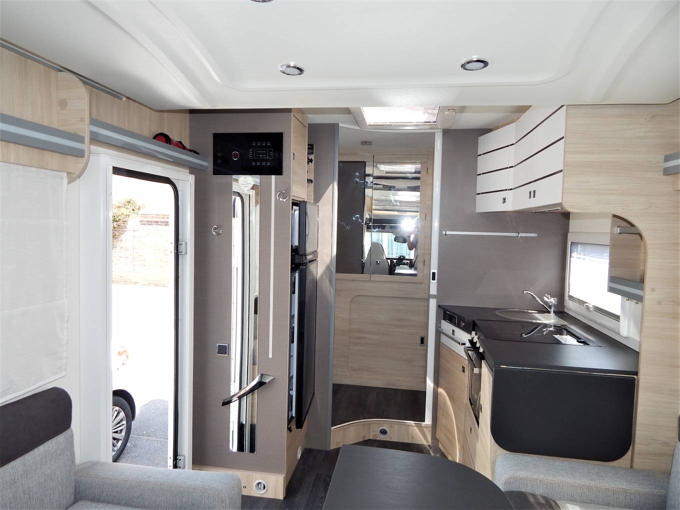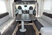 We enter the vehicle on the drivers side immediately to the right of the habitation door is the dinette which consists of two opposing two seater sofas either side of the gangway. The table position IS offset to the passenger side but can be moved to centralise, it folds in the middle for easy access moving fore or aft. The front two seats rotate to join this area so you could easily seat 6 people around the table if entertaining on site. At night the table can drop down to make this area into an additional double bed with the use of infill cushions. Two travelling seats can ALSO be found below the sofa bases with lap & diagonal belts.
