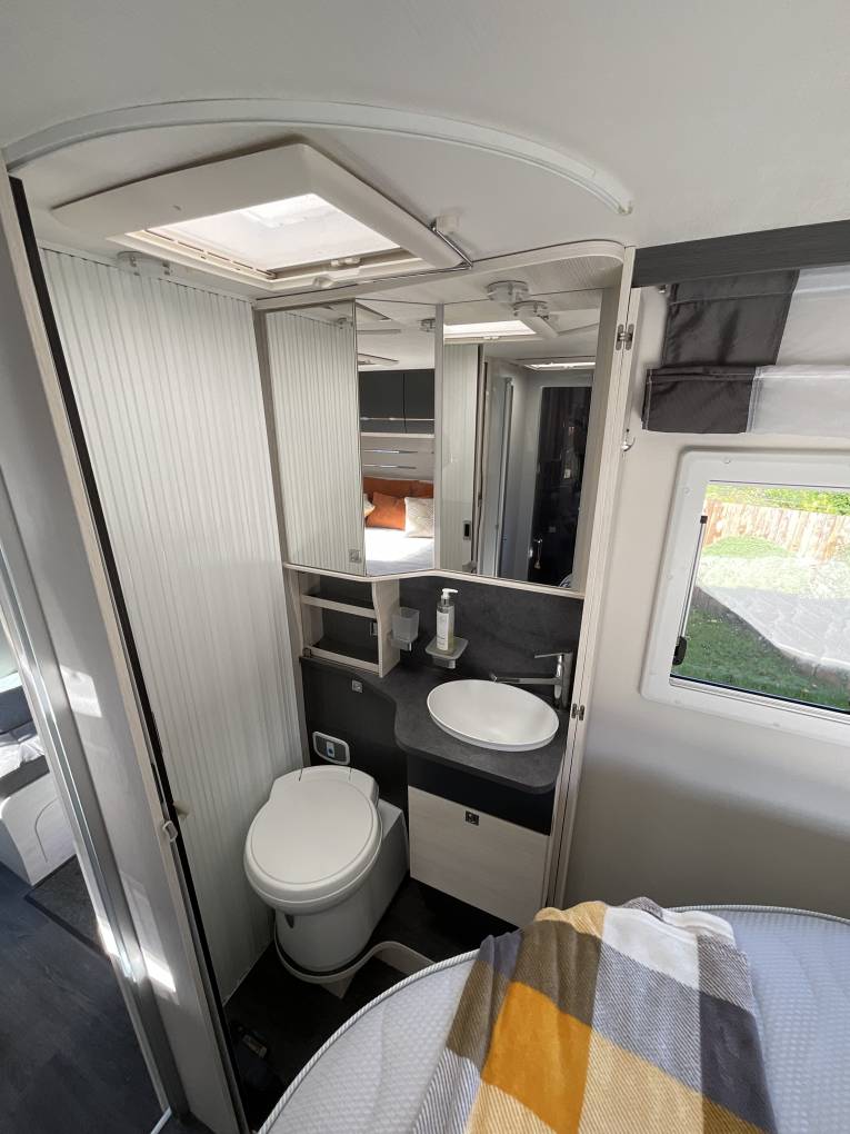 The living quarters are fitted with luxurious trimming and fittings and the panoramic skylights and abundance of LED lighting give it a light and airy interior. There is 12v and 230 volt throughout. The lounge/dining area has inward facing seats with an adjustable table. The sofas also have underneath them 2 forward facing, belted travel seats that can be folded up and out into position when required. Above the lounge is an electric drop-down bed, dimensions are 6’3” x 4’7”. The kitchen is equipped with cooker with a hob, oven and grill, a basin and 141litre fridge/freezer. The island bed in the rear measures 6’3” x 5’3” and sits over a very large rear garage, it is height adjustable to vary garage space. There is a separate shower room and a toilet/washroom on the opposite side of the motorhome. There is also a 12v fan skylight in the bedroom area. Heating uses van fuel (diesel) and not gas and can be used whilst travelling so you arrive warm.