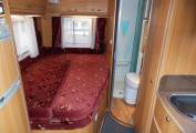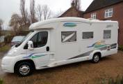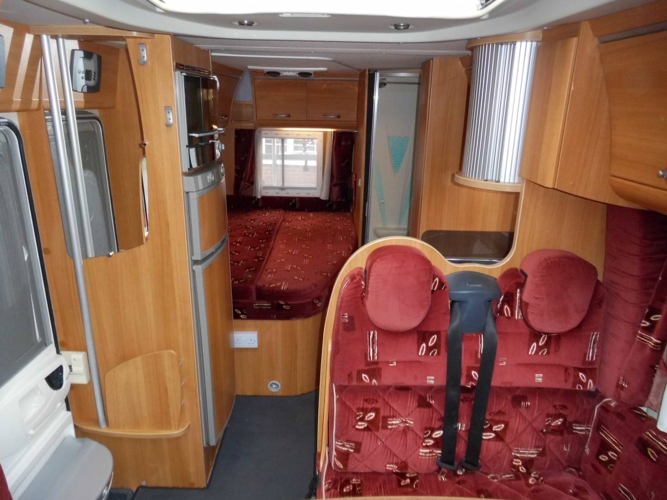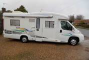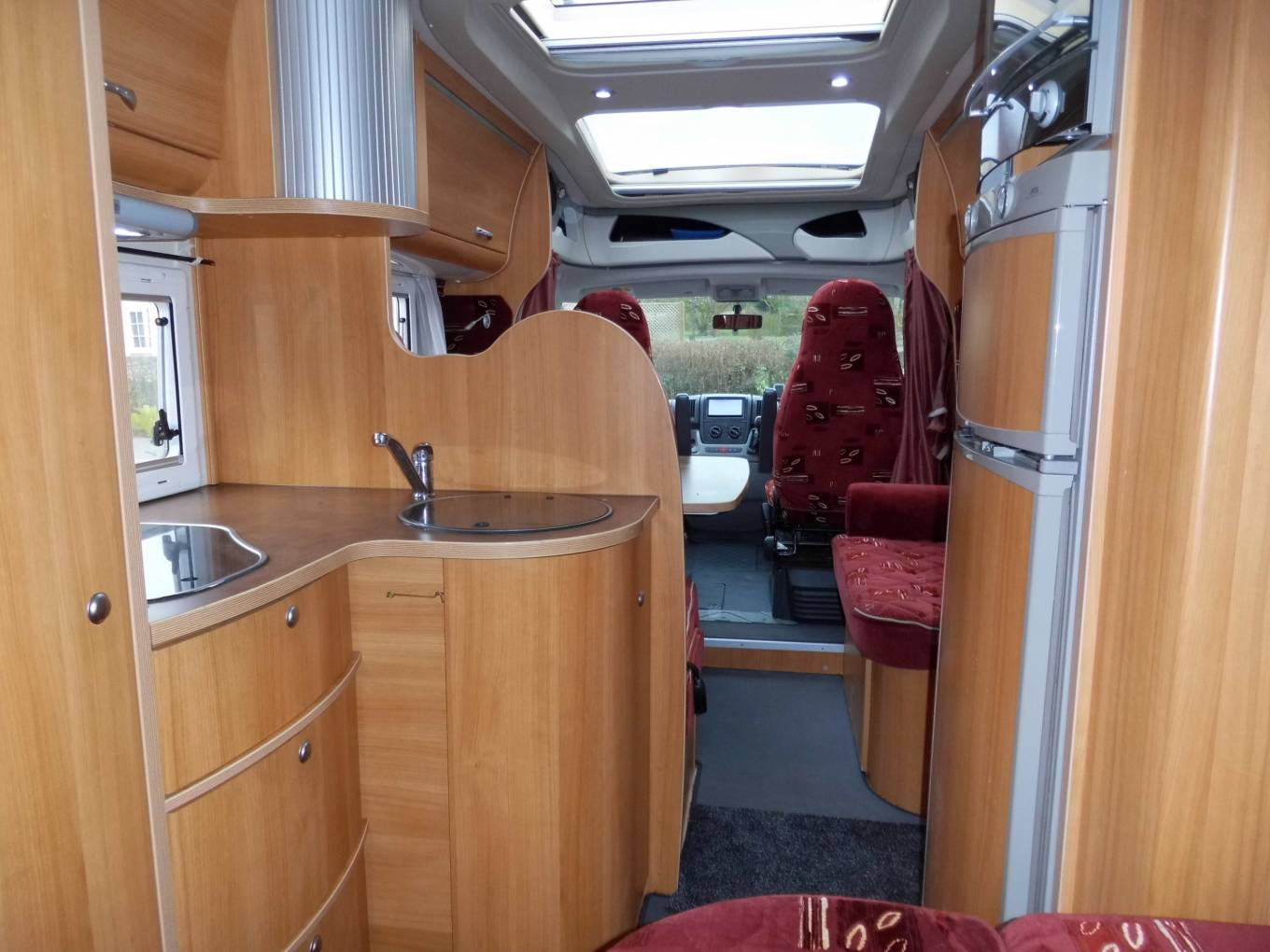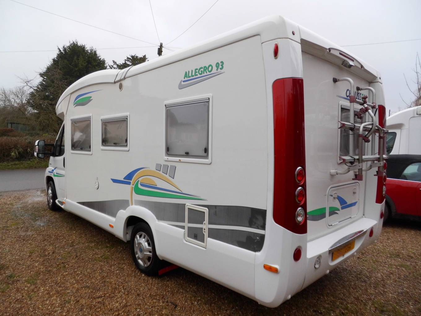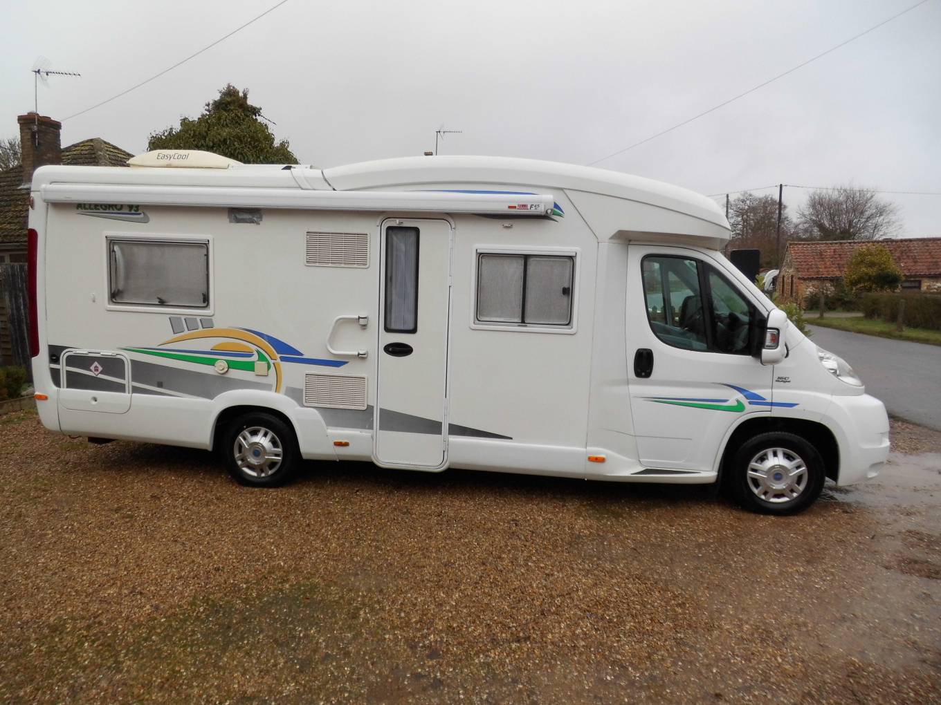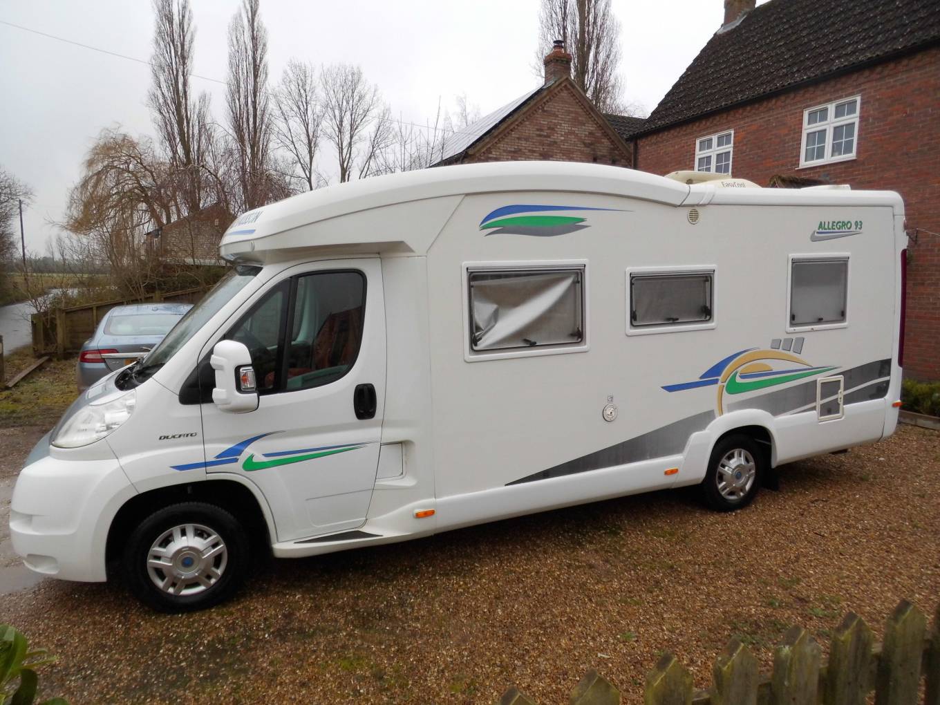 Chasson Allegro 93 4 berth motor home with rear fixed bed and 4 seat belts. Built on a Fiat chassis with a 3000 cc diesel engine. It is right hand drive, 6 speed manual gearbox. On entering the motor home through a side door, immediately in front of you is a lovely kitchen area containing a 3 ring gas hob with a glass lid, high level oven and grill, extractor fan, a large fridge freezer and a sink/worktop area. Moving to the front of the motor home is a spacious lounge area consisting of L shaped sofa and a removable dining table which also converts into a double bed, and a further sofa opposite. Both of the front seats swivel making it a perfect socialising area. One of the sofas is front facing with two 3 point seat belts. Moving to the back of the motor home there is a fixed double french bed with ample high level storage cupboards and wardrobe. To the right of the bed is a spacious light and modern washroom, consisting of toilet, shower, and mirror vanity unit. Each window has fly screens, blackout blinds, curtains and voile curtains. A curtain separates the cab from the habitation area. There is ample LED lighting throughout the motor home making it nice and light. The motor homes comes with cab and habitation air conditioning as well as heating. The flooring has a grey carpet which is removable revealing a vinyl wood effect flooring. There is a large sunroof in the centre of the habitation area. Nice motorhome suitable for families. There is a few marks and a cracked trim near the door and outside light above the door has a new glass on order, please ask for pictures.