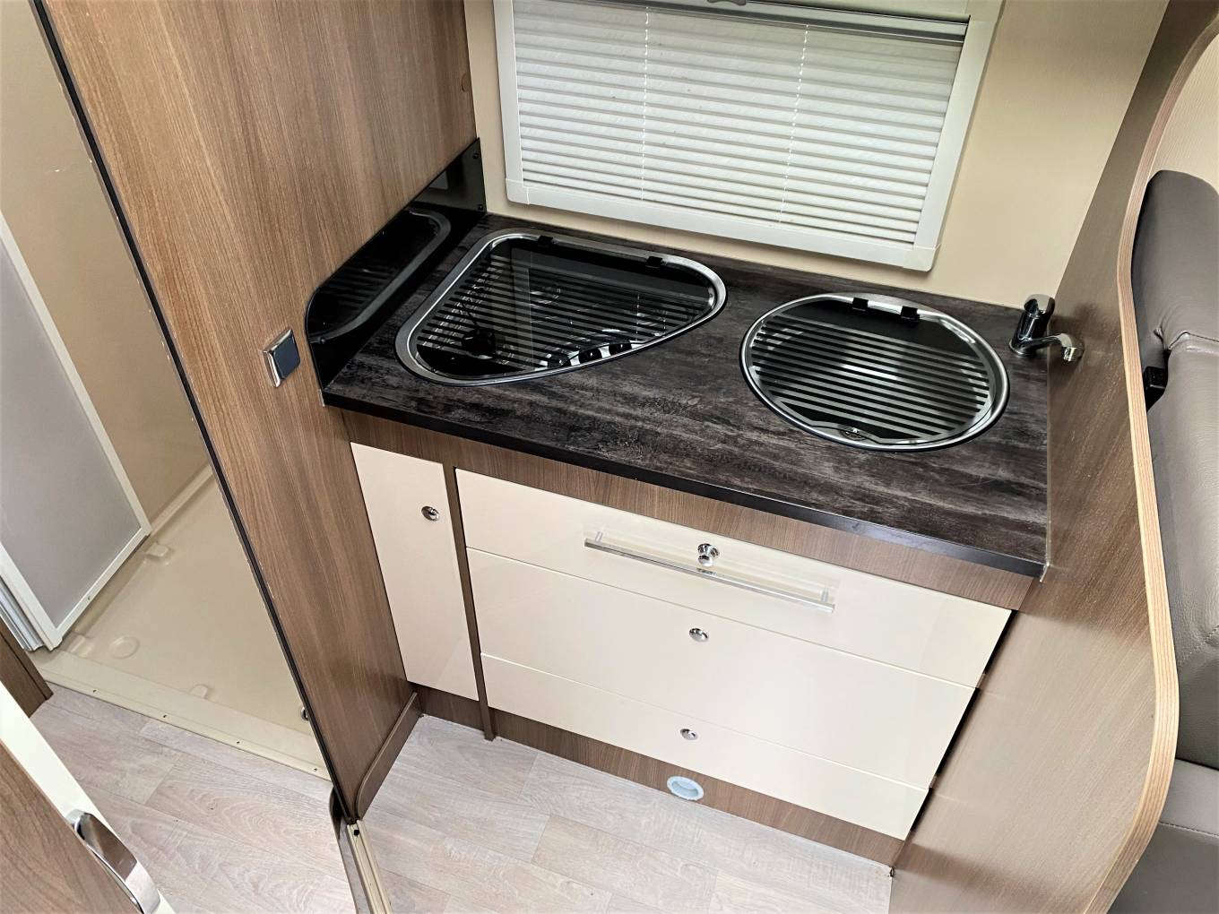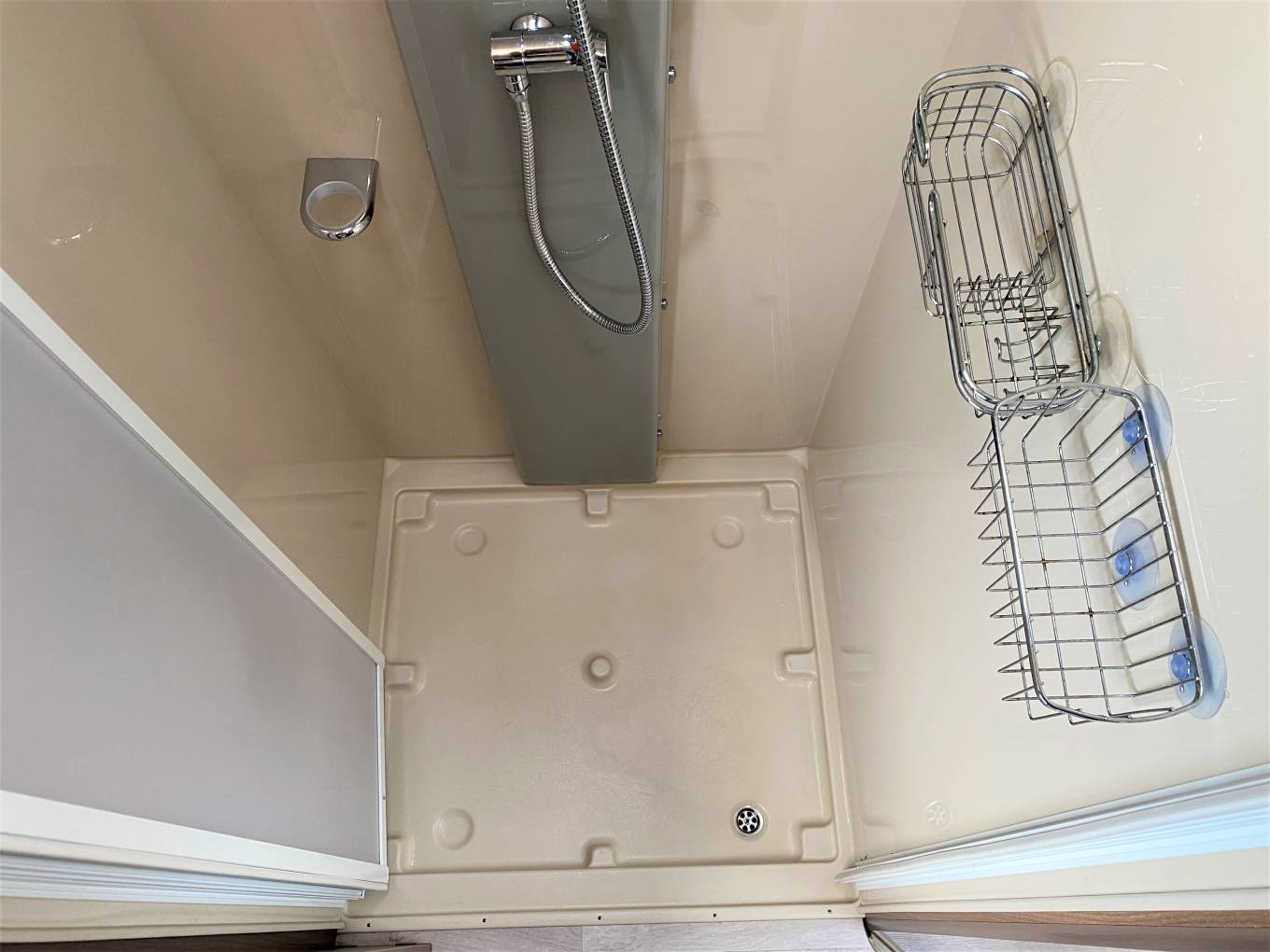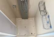 It has a cassette toilet and separate shower as well as, believe it or not, a fridge with separate freezer. Amazing use of space!