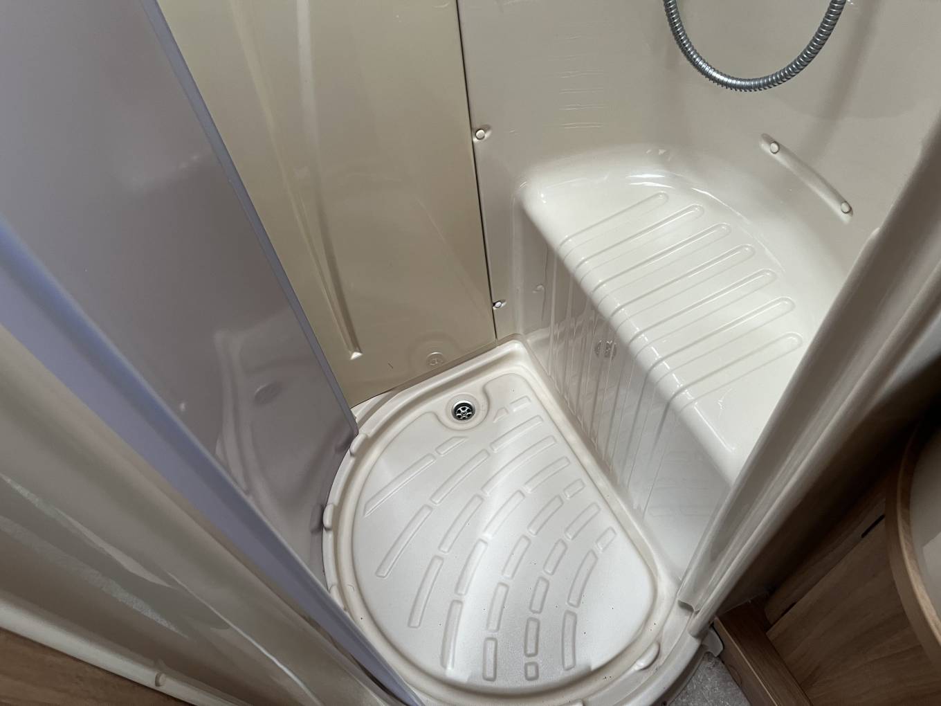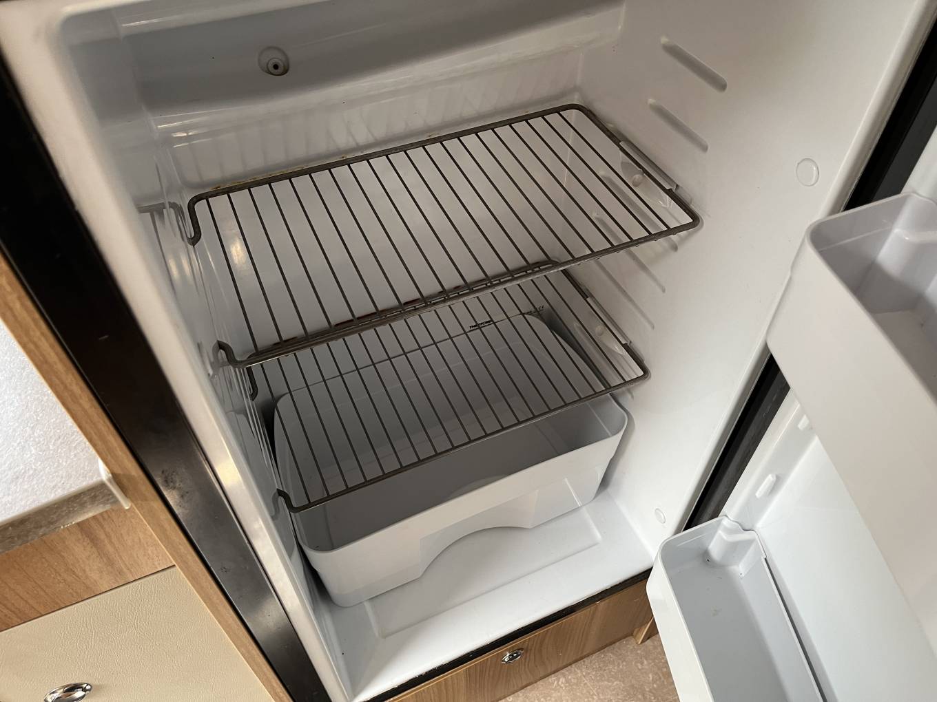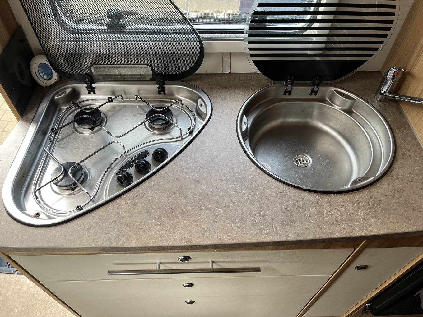 offside, you find the kitchen area immediately to your left. There is a 3-burner hob and a sink surrounded