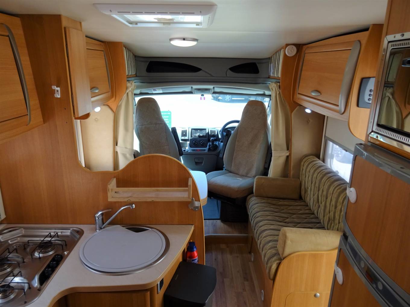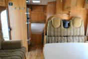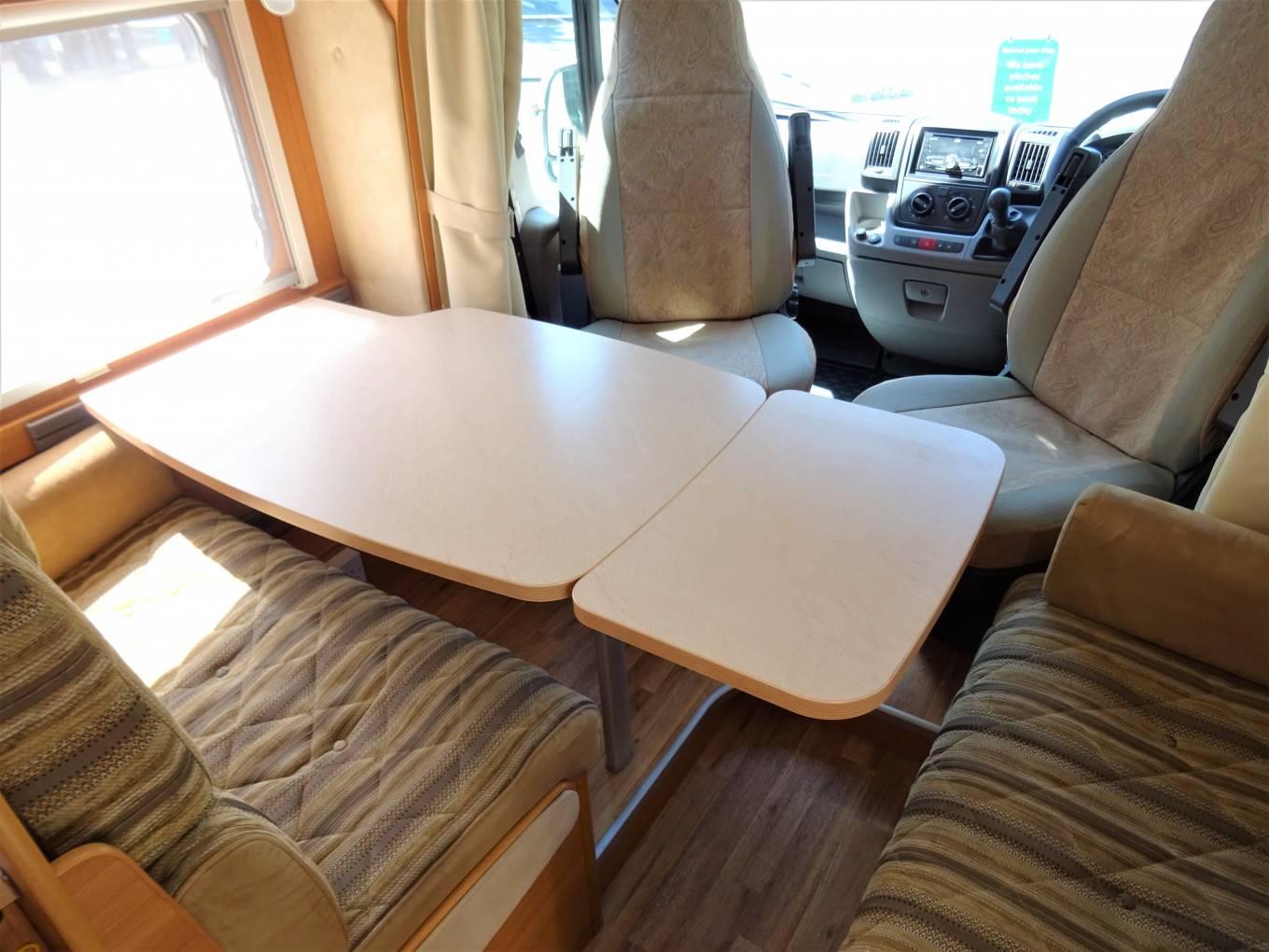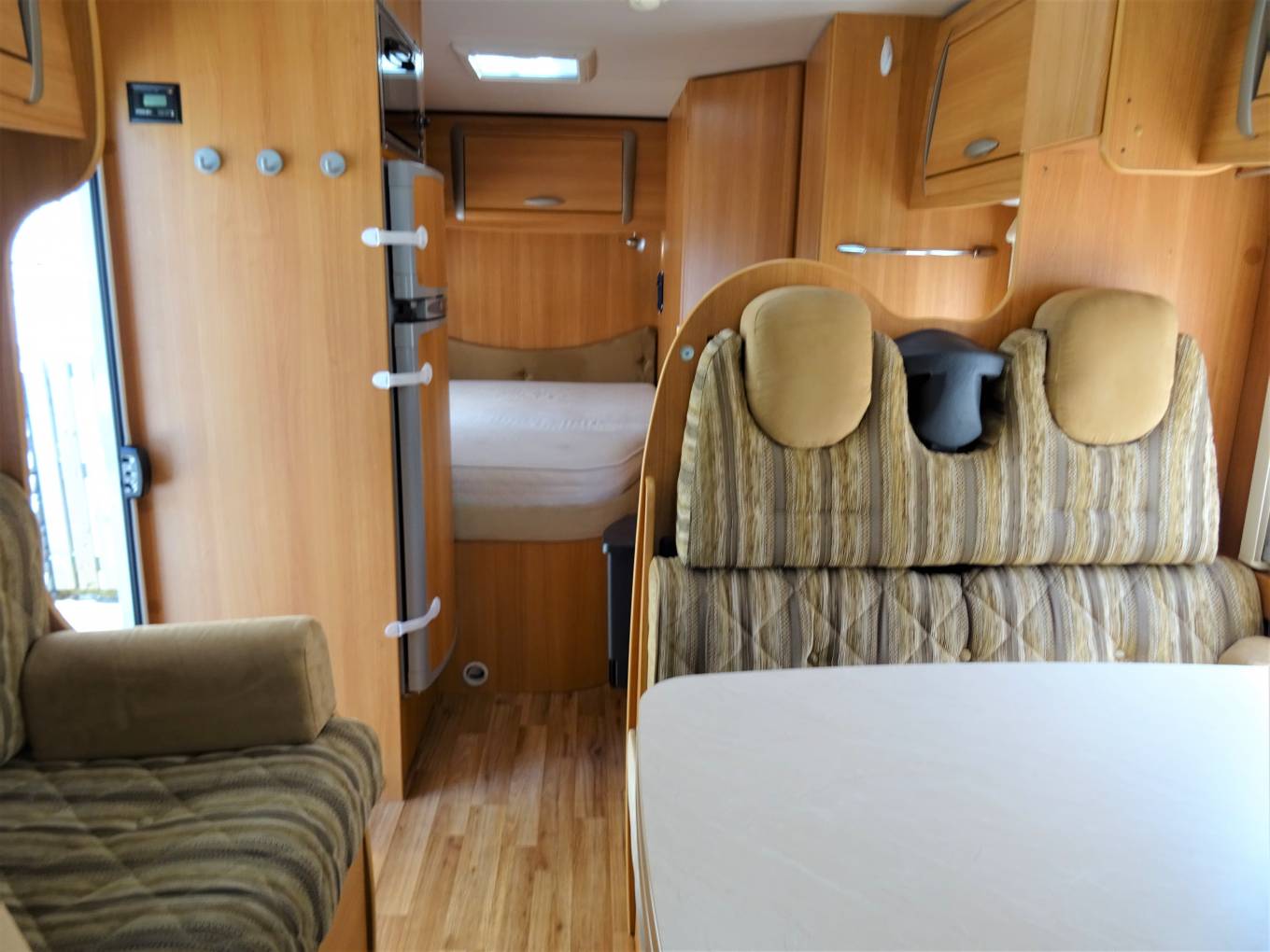 It is a great layout inside with the fixed bed at the rear that has good storage above and below. The washroom is a generous size and has toilet, sink and shower area with plenty of room. The kitchen has a 3 gas burner hob, SMEV oven/grill , microwave and large fridge freezer . The upholstery is in good condition especially in the dinette area with 2 forward facing seats that have full seatbelts and opposite a small sofa and this area can be made up into another double bed if needed. There is enough seating here to comfortably seat 6 people, especially as the table will extend and the front seats swivel.