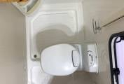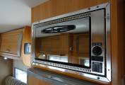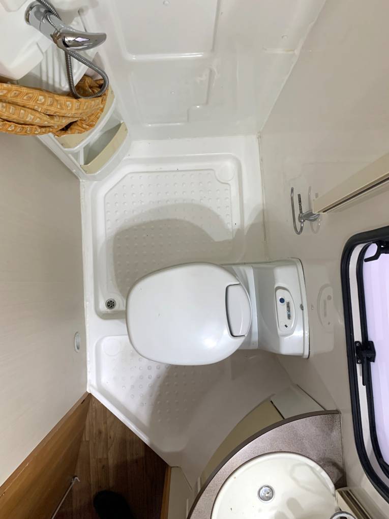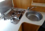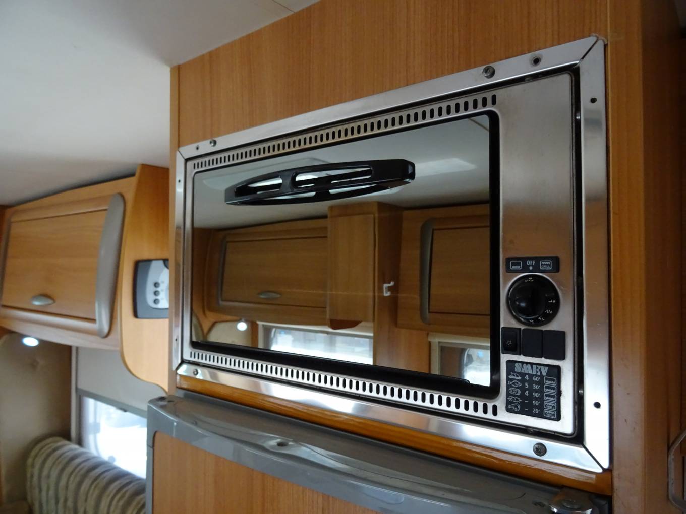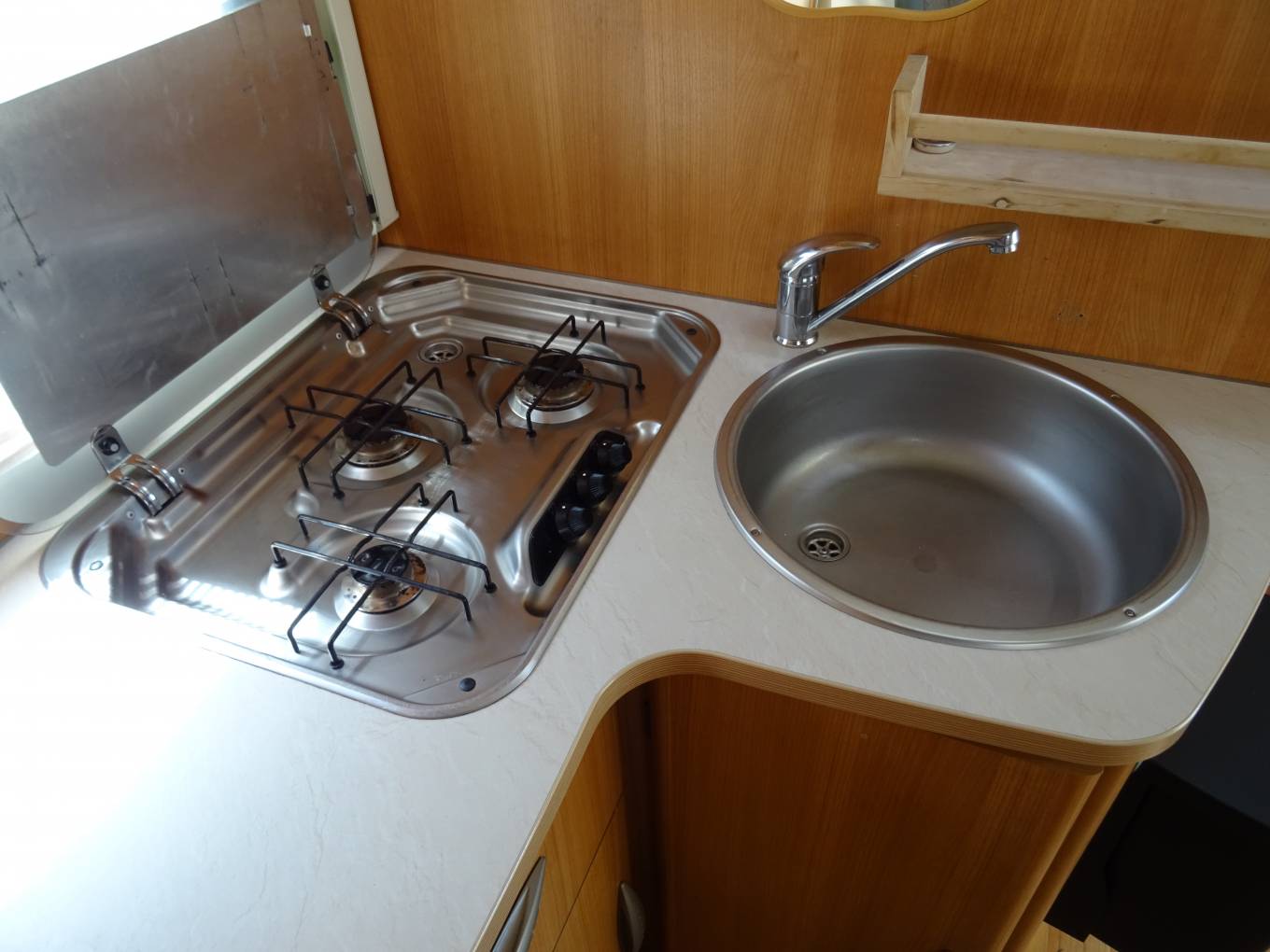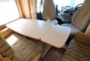 It is a great layout inside with the fixed bed at the rear that has good storage above and below. The washroom is a generous size and has toilet, sink and shower area with plenty of room. The kitchen has a 3 gas burner hob, SMEV oven/grill , microwave and large fridge freezer . The upholstery is in good condition especially in the dinette area with 2 forward facing seats that have full seatbelts and opposite a small sofa and this area can be made up into another double bed if needed. There is enough seating here to comfortably seat 6 people, especially as the table will extend and the front seats swivel.