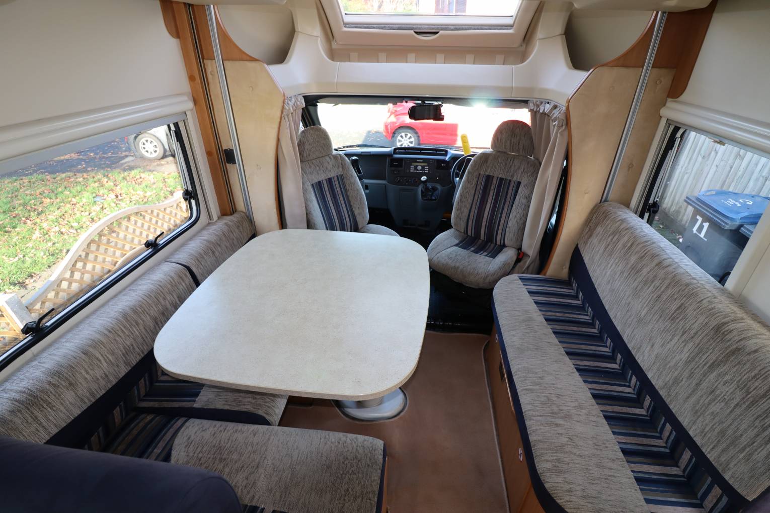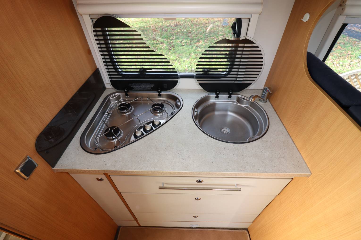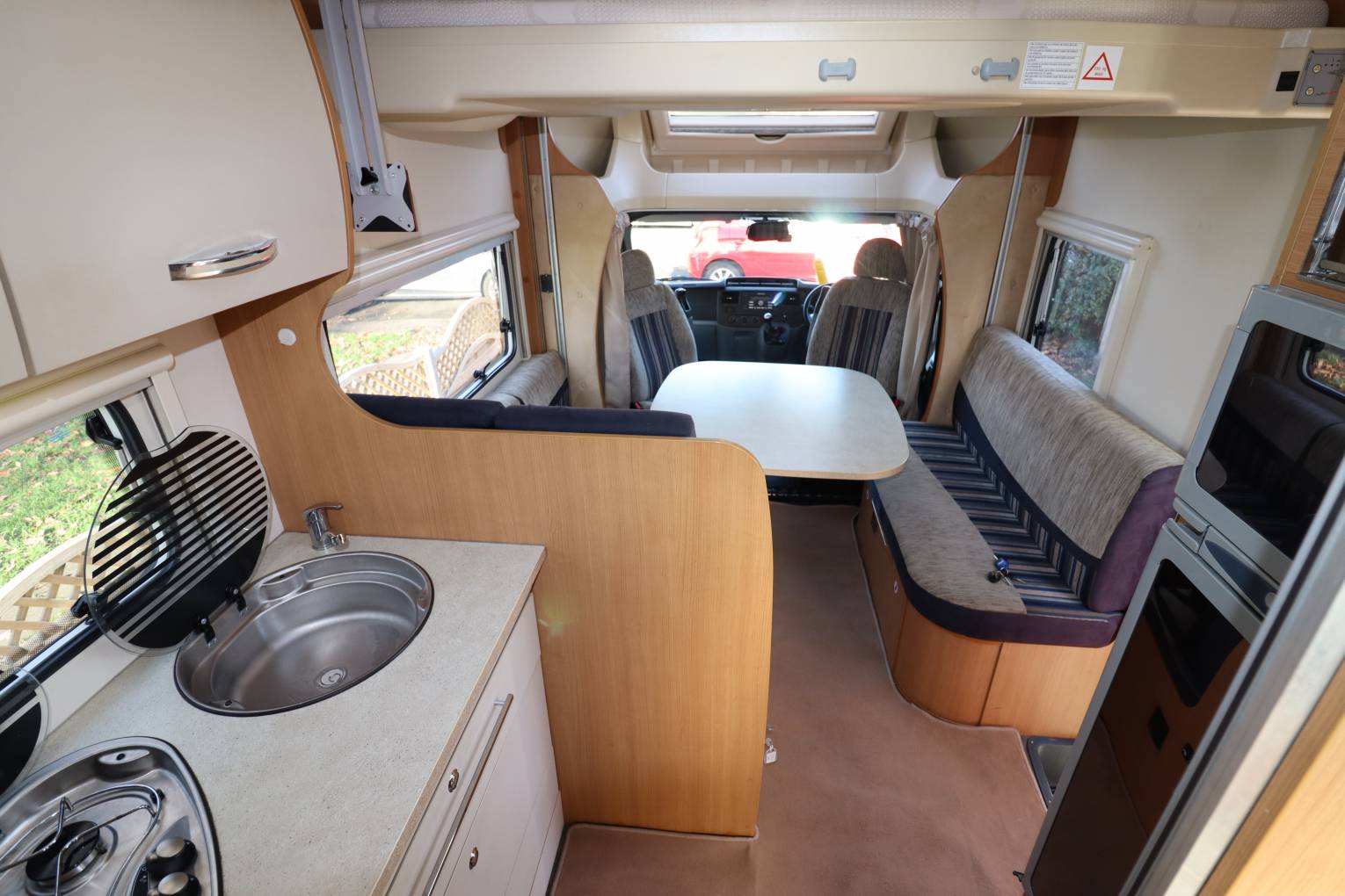 A Lovely compact motorhome with an electric drop down double bed and 4 travelling seats. The lounge is spacious with both front seats swivelling. The table is fixed and drops down to make a double bed. Above the lounge area is a electric drop down bed that can be left made up and stows neatly away. The kitchen is central fully equipped with the washroom across the back with a separate shower cubicle. Ample storage externally and internally. Extras include; Refillable Gaslow 11KG bottle; Satellite TV (TV not Inc), Awning, BBQ point, Twin lens reversing camera; Solar panel, Twin Leisure batteries, bike rack and Tow bar.