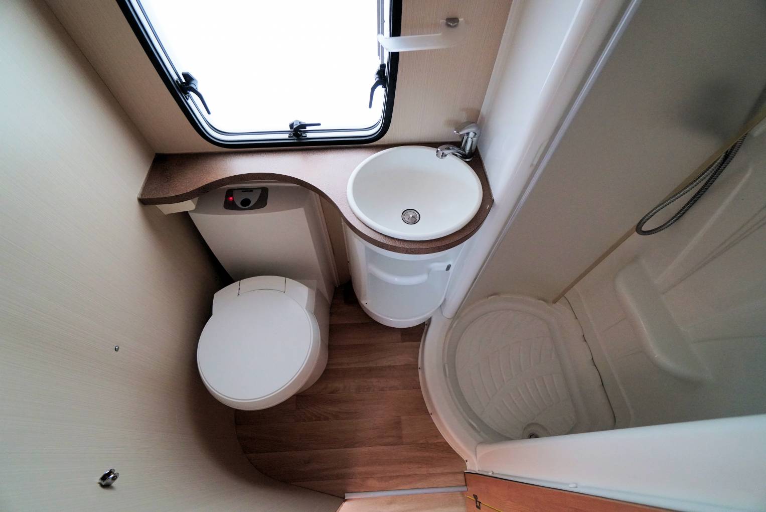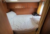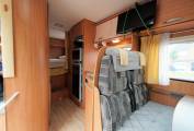 Step inside the habitation area and to the front you have the lounge / dining area where you find a two person forward facing bench seat complete with two 3-point seatbelts and a longitudinal bench seat with one lap-belt, Both the driver and passenger seats swivel into the area and with the large dining table with extension piece, there is room for 6 to dine in comfort. There is a TV fitted in this area and a double over cab bed, that folds up when not in use to give better access to the cab from the habitation area. The kitchen is found in the centre of the motorhome and has a 3-burner gas, hob, oven / grill, stainless-steel sink with mixer-tap and large 3-way fridge with a separate freezer compartment. Opposite you will find the washroom with Thetford cassette toilet with electric flush, basin with mixer tap and separate shower area. At the rear you will find the large transverse double bed that you access using a small step-up. The bed is located over the huge rear garage that can be accessed from below the bed. Blown air heating and hot water is supplied by the Truma Combi unit and there are removeable carpets throughout. As well as the large garage area, externally you will find a Fiamma wind-out canopy and a bike rack.