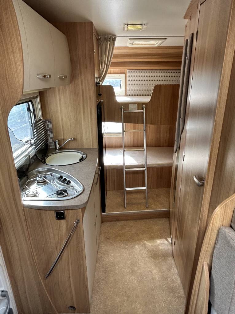 We will start at the rear with the fixed bunk beds. 2 large single beds perfect for adults and children alike with a removable ladder to reach the top bunk. The bottom bunk can also be cleverly rearranged into a large garage space leaving the top bunk in place giving you extra options based on your needs. You have a large wardrobe space just in front of the Bunk Beds.