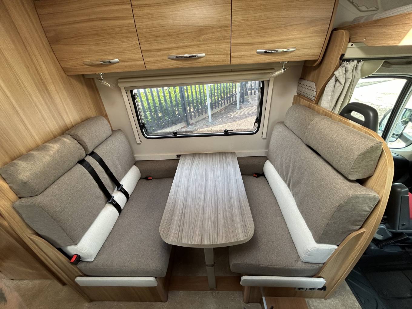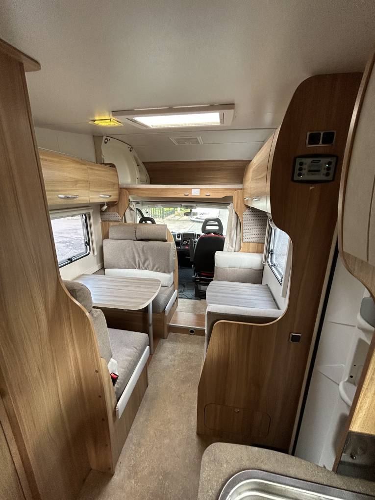 Mid Habitation you have the dinette area. Newly upholstered to a high standard with separate 4-seater and 2-seater areas. The main 4-seater space comes with 4 seat belts to help travel those extra guests and makes for a comfortable eating and relaxing area. The table pops down to make into a roomy double bed for sleeping.