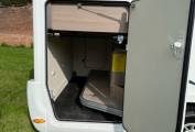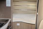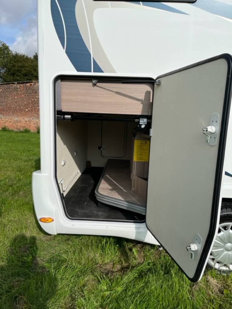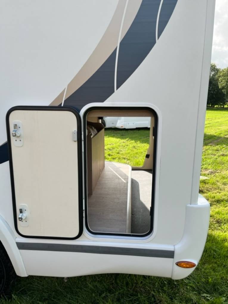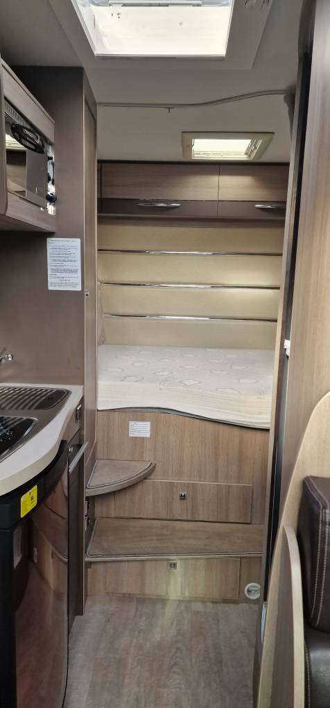 Fixed rear double bed over a spacious garage accessible from both sides.