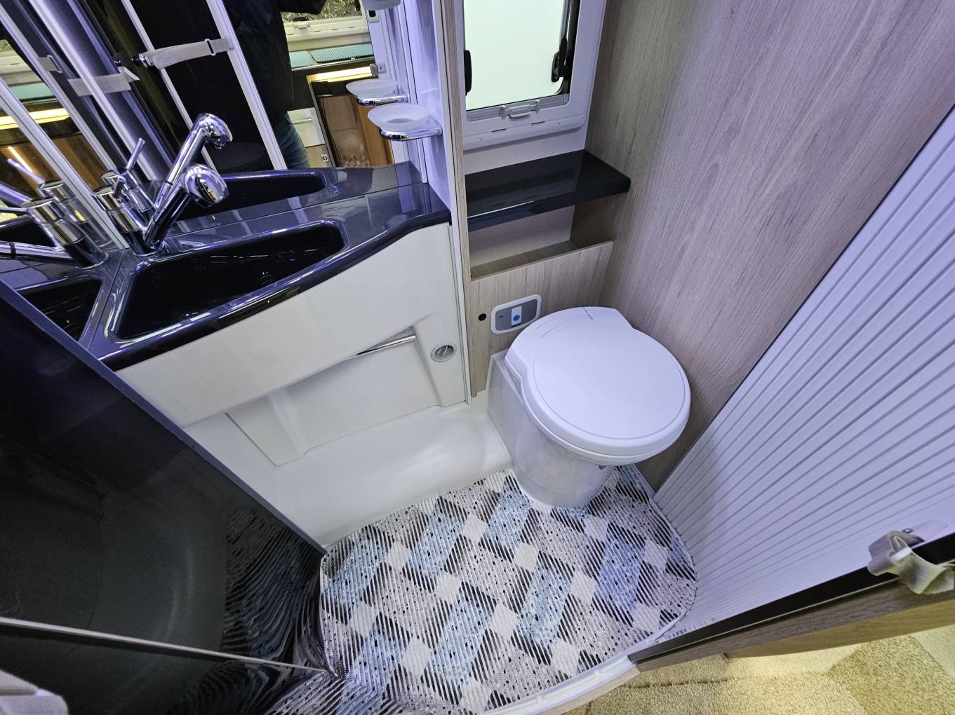 The washroom comes complete with toilet, washbasin plus shower and floor protection mat
