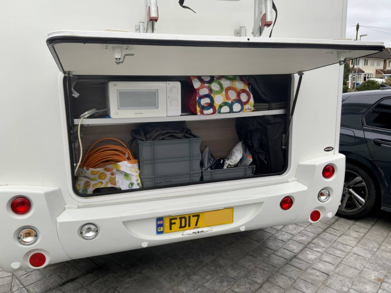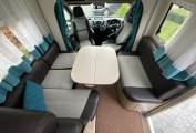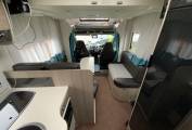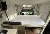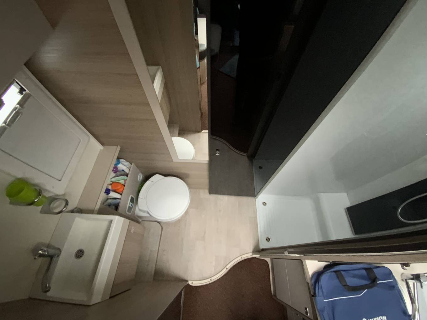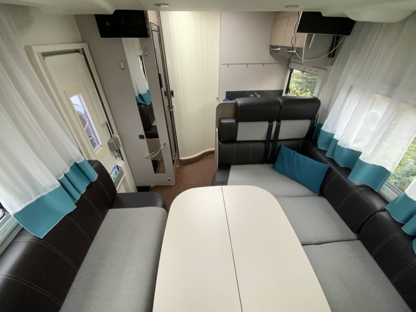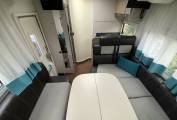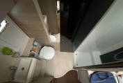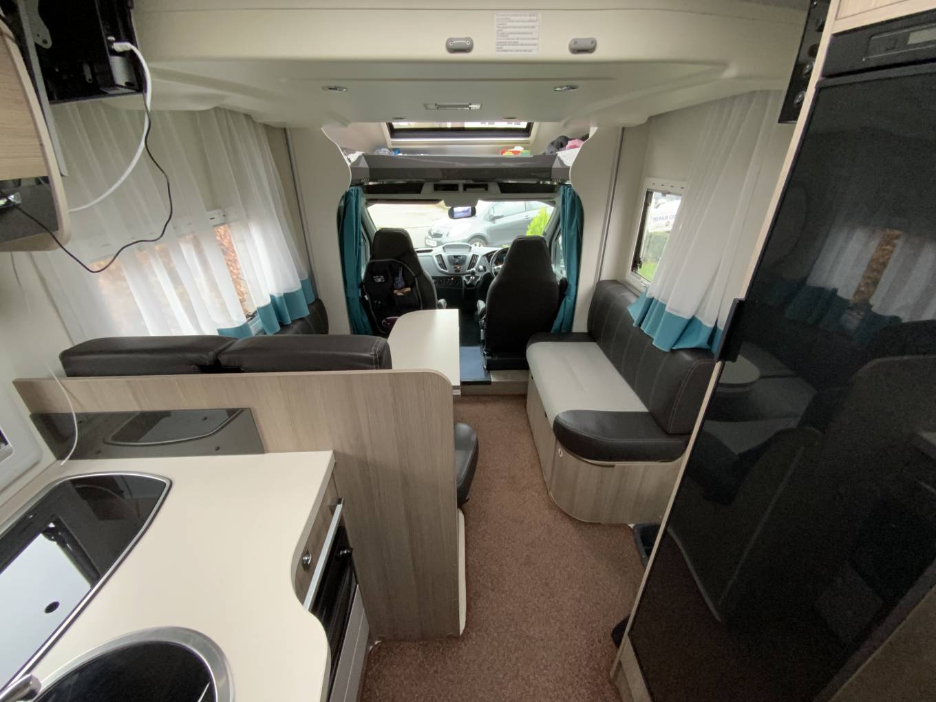 At the front of the vehicle there is a generous seating area that can easily seat 5 or 6 when using the swivel front seats, the table lowers electronically to create a good sized double bed. Over the seating area is an powered drop down double bed that stows neatly into the roof when not in use. Moving toward the rear of the vehicle there is a well equipped kitchen area with full height fridge freezer, grill, sink and 3 burner hob. At the rear of the vehicle is a huge washroom with basin, cassette toilet, wardrobe and separate shower cubicle. Externally the vehicle has a good sized rear storage locker, bike rack, wind out canopy awning, reversing camera and 150w solar panel.