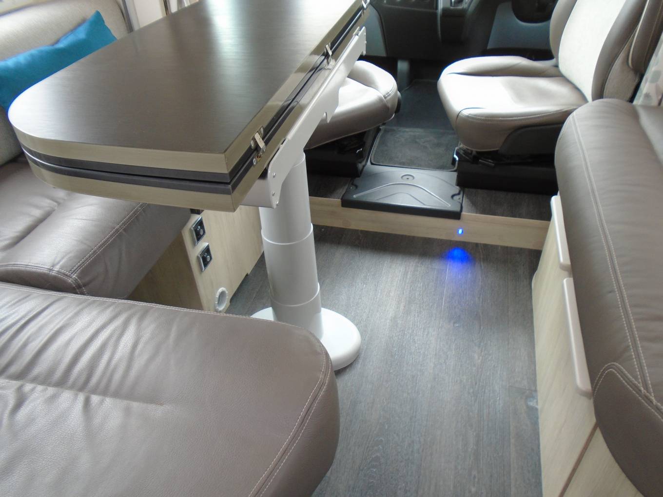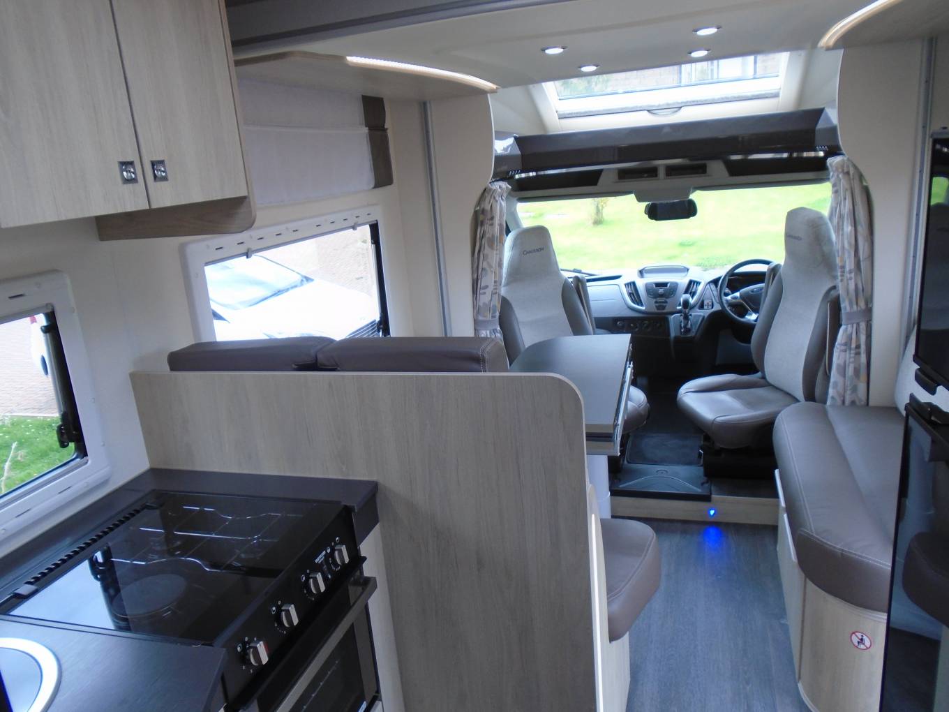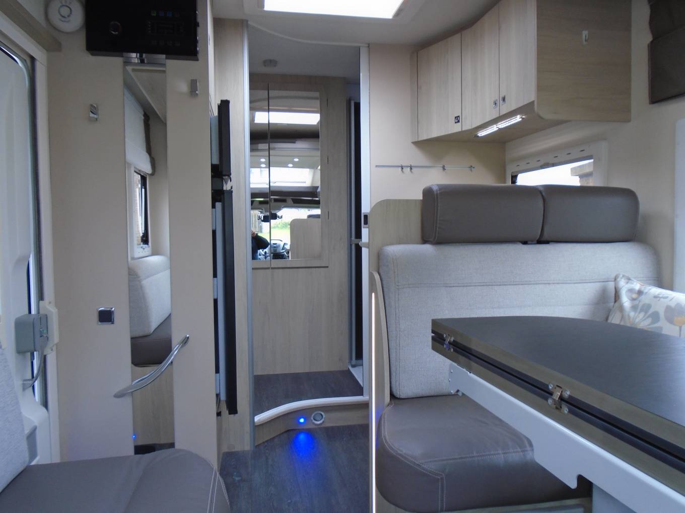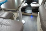 Moving into the lounge, we have a fixed but adjustable folding table, with comfortable seating for six when the swivel chairs are in position. The lounge area quickly and easily converts into a good size double bed with plenty of overhead space when the electric double bed is lowered. The electric drop-down bed can be accessed by ladder, or has the ability to be lowered to a mere 76 cm from the floor for easy entry.