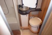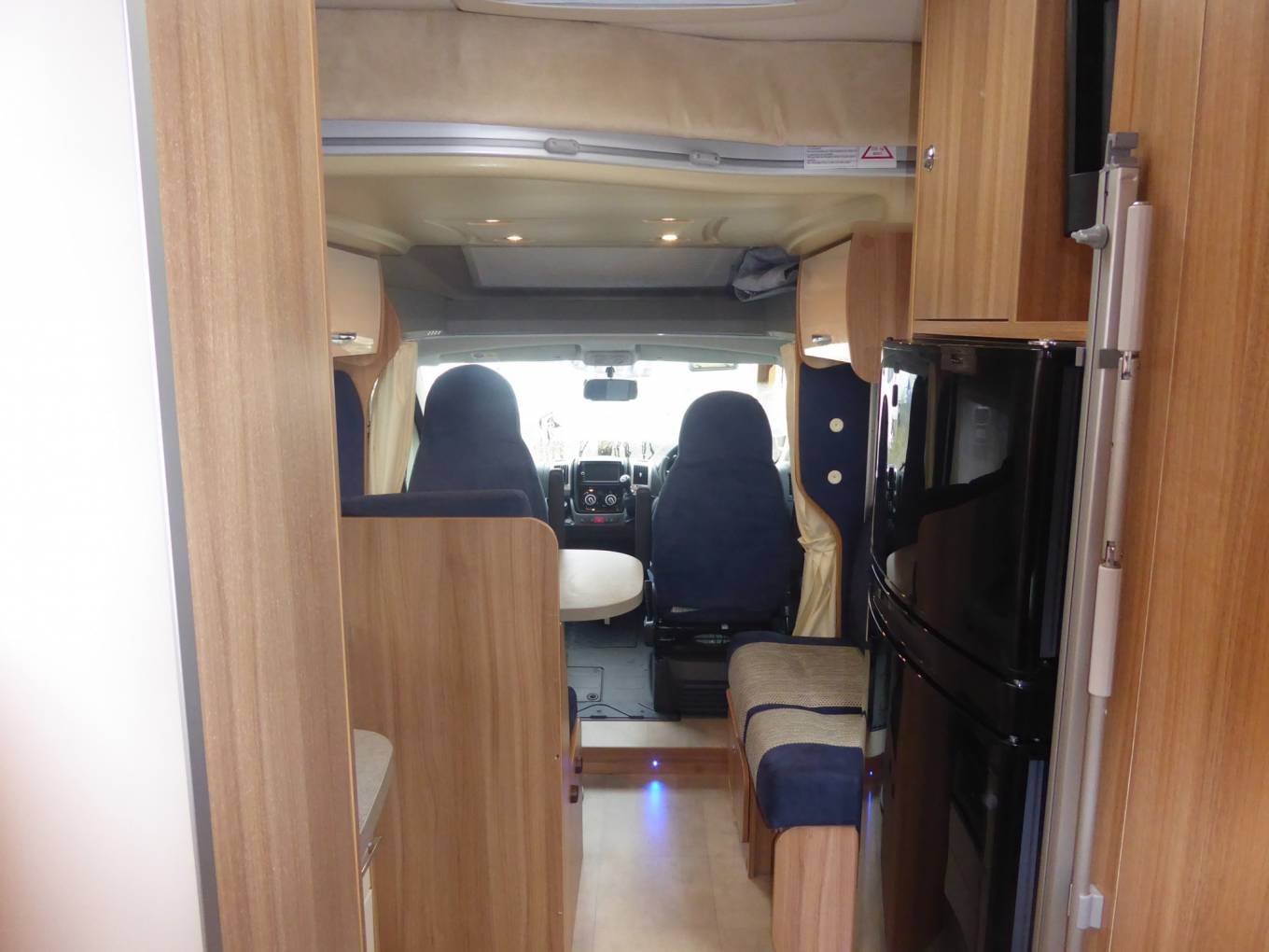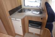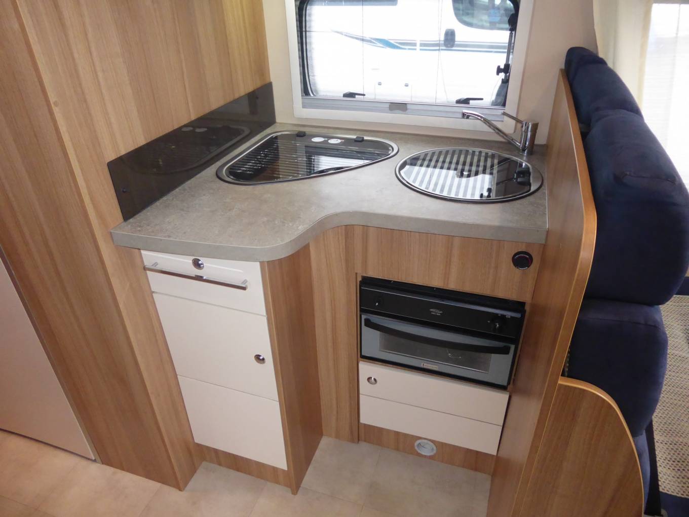 Behind the bench seat is the nearside central kitchen, with a hob with 3 gas burners, a grill, and a sink. Opposite is the fridge and separate freezer.