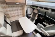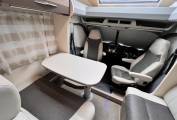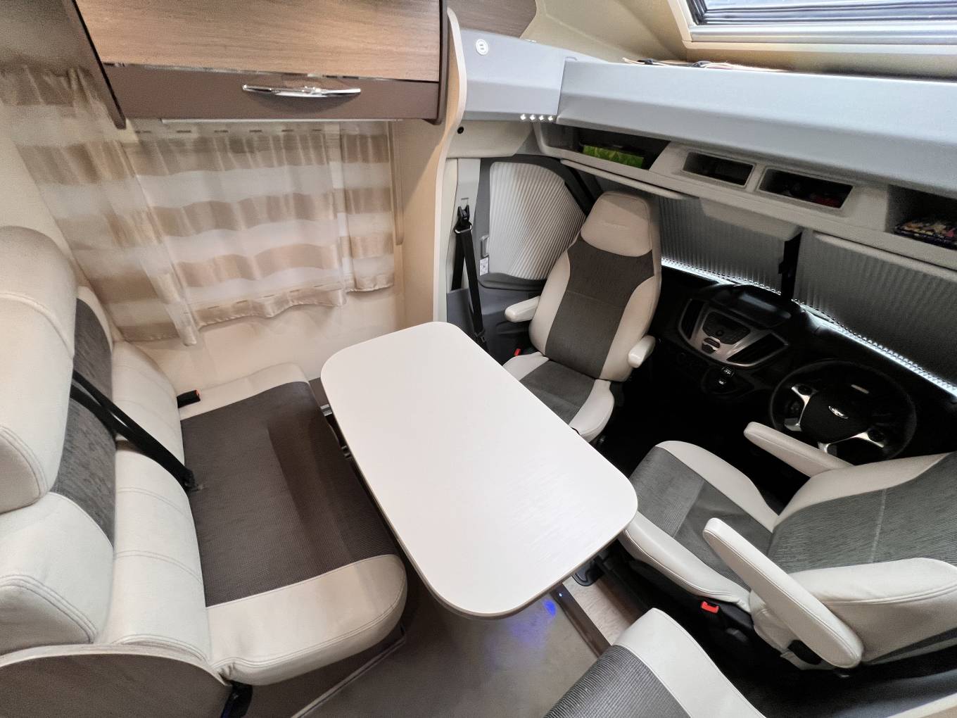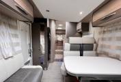 On entering via the flyscreen protected habitation door, in front of you is the lounge, consisting of twin forward facing belted seats, an inward facing side settee, twin swivelling cab chairs and a pedestal mounted table that can be moved in multiple directions for dining.