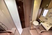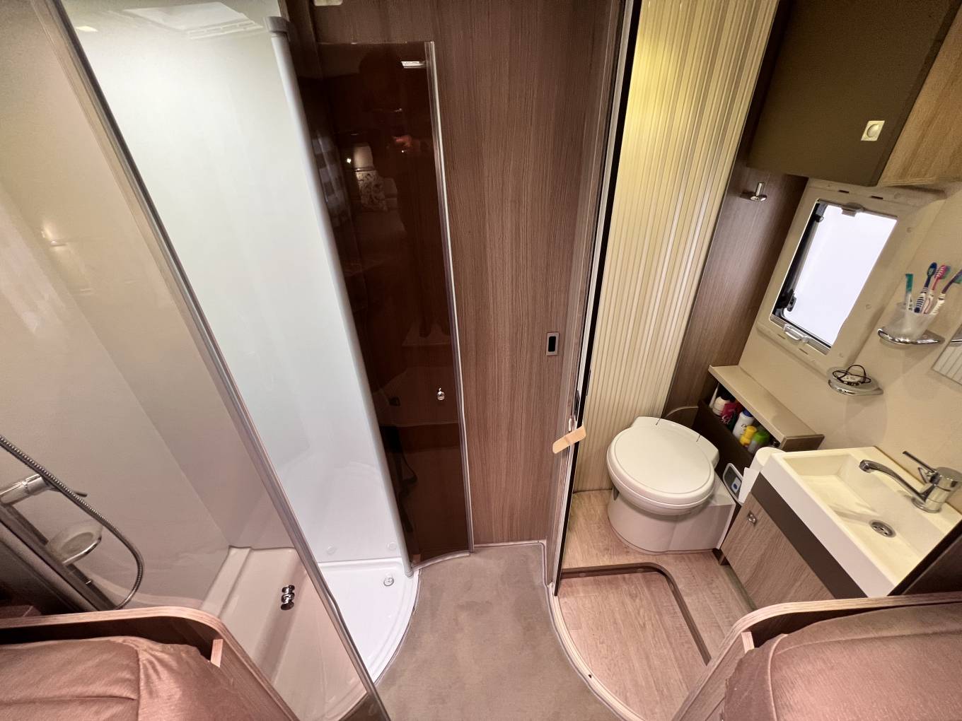 On one side is a Thetford electric flush cassette toilet, wash hand basin and cupboard space and on the other the shower cubicle with twin drain holes at the base to help when the ‘van is not 100% level.