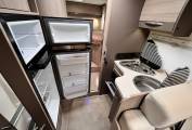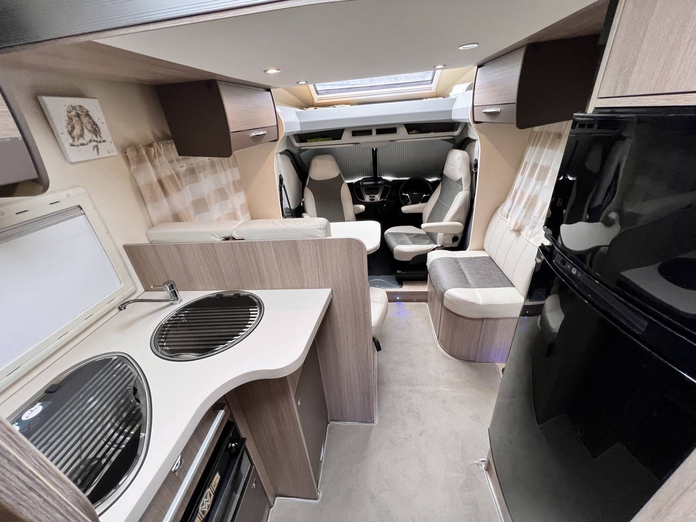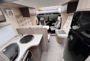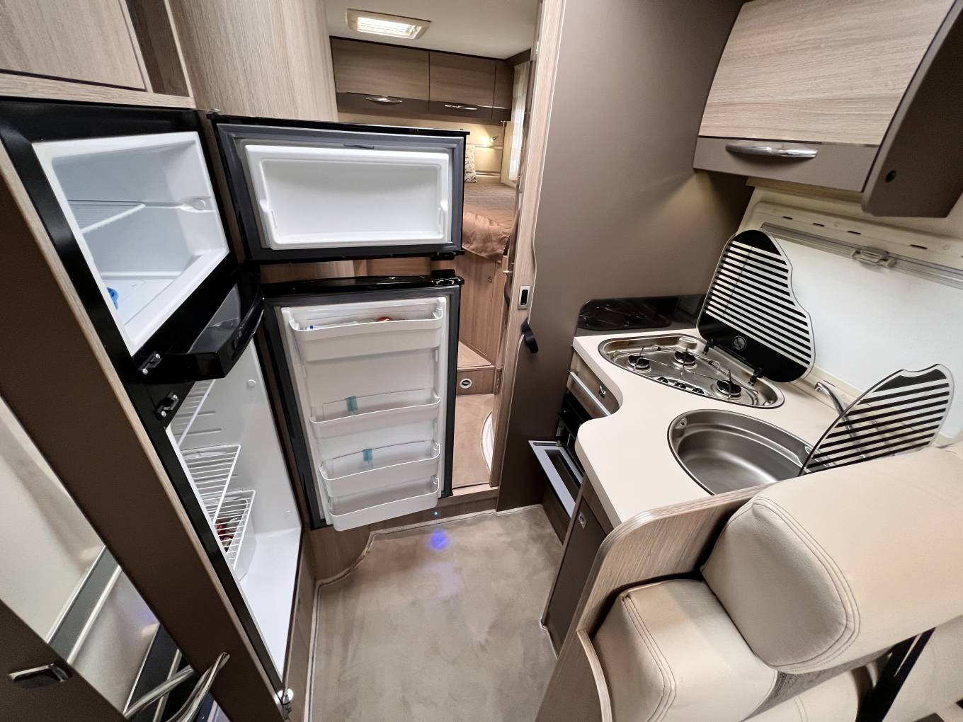 The kitchen is across the centre of the motorhome consisting of a three burner gas hob, a grill, a three energy source Thetford fridge with a separate Freezer, a sink with a removable drainer and hot & cold water supply.