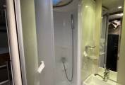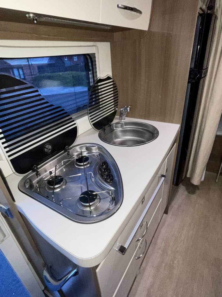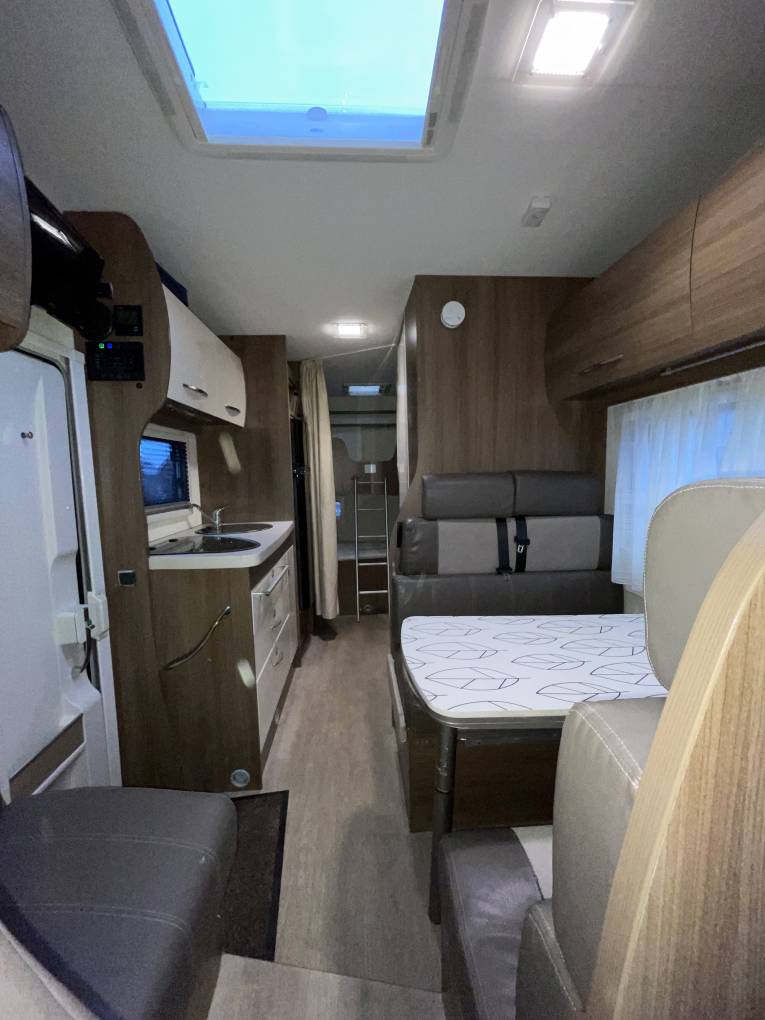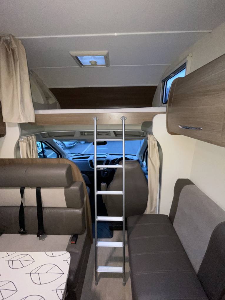 Built on a Ford chassis with a 2.2 litre diesel engine and 6 speed manual transmission, cruise control and cab air conditioning with just two registered keepers, it has had a stint as a hire vehicle hence mileage showing 62,537. With that said, it is in good condition and going cheap for a motorhome of this year! Inside the 626. There are 4 three point seatbelts plus 2 Lap belts allowing for 6 passengers. Fixed at the rear are bunk beds that could also be utilised as a garage space when travelling. The joining washroom is well lit, presentable and spacious. Opposite the washroom is where the kitchen begins, which too is modern and well equipped with grill, tall fridge and separate freezer, sink and 3 gas cooking hobs. Up front we have a 4-seater dinette that can also be transformed into a sleeping area without blocking the walkway to the washroom. A large double bed over-cab that can also be used for extra storage space when not in use.