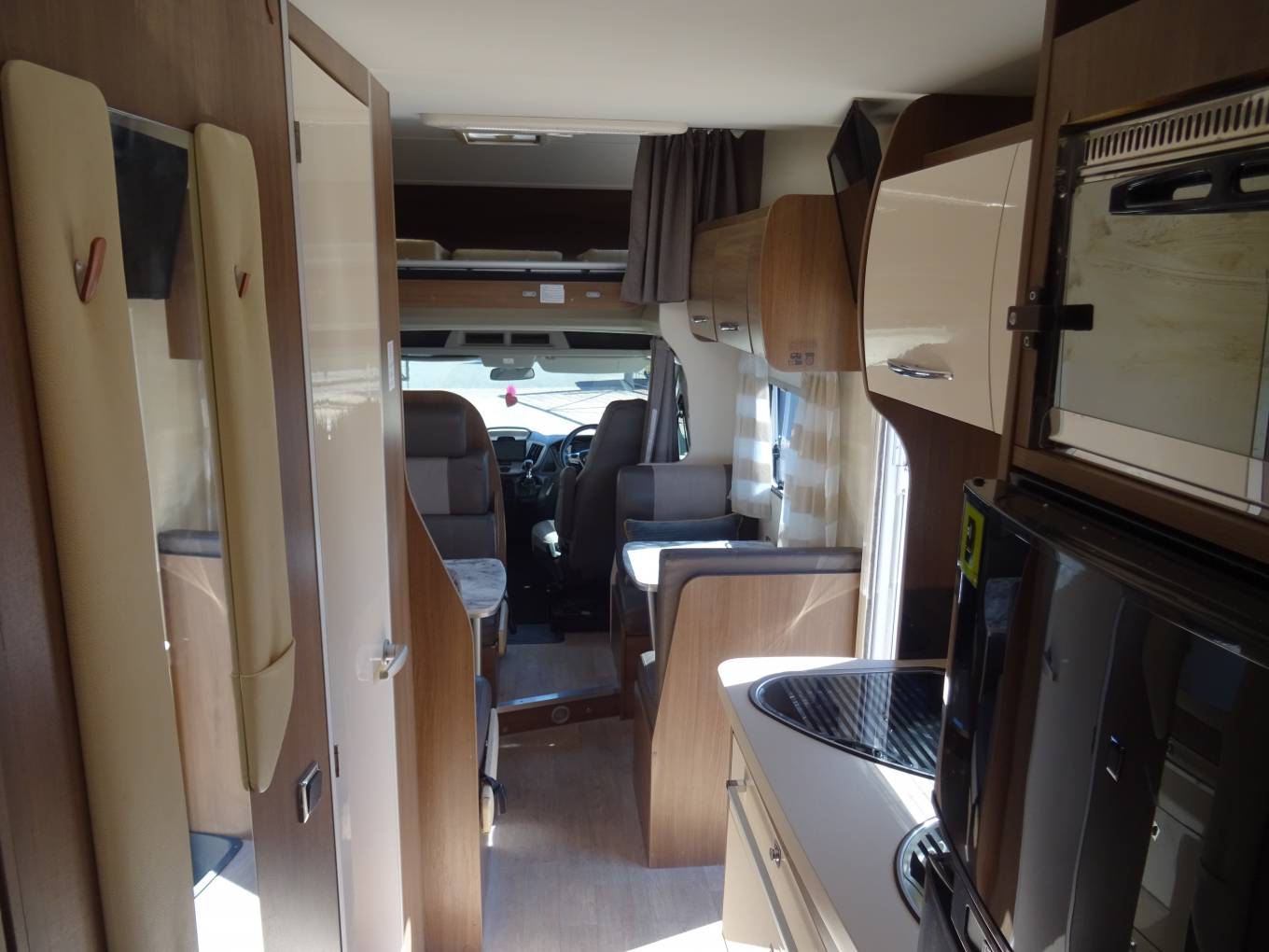 This Chasson Flash C636, has rear are bunk beds that could also be garage space. The joining washroom is well lit, presentable, and spacious, with a separate shower cubicle. Opposite the washroom is where the kitchen begins, which too is modern and well equipped with a grill, large fridge, and separate freezer, sink, and 3 gas cooking hobs. Up front there are two dinette tables with seating to comfortably accommodate up to 6 people and can also be made up into a sleeping area without blocking the walkway to the washroom. A large double bed over-cab that can also be used for extra storage space.