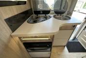 find the kitchen area with sink, three-ring gas hob, combined oven and grill