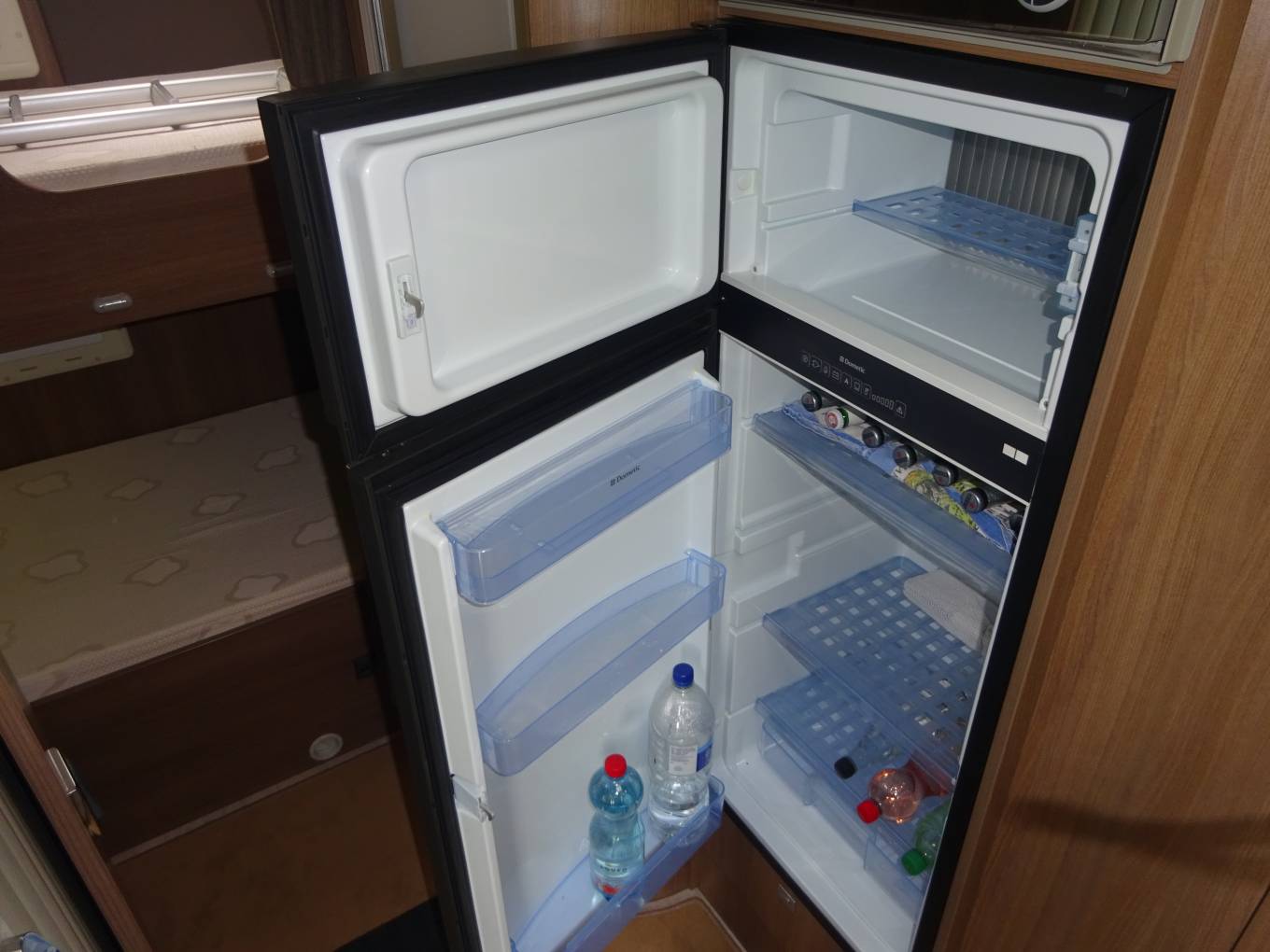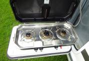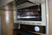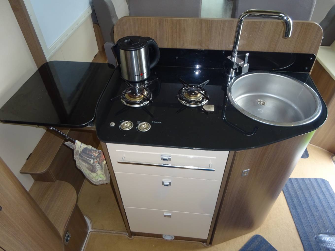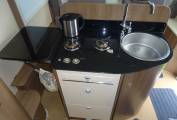 To the centre of the Motorhome you will find the Island Kitchen area which comprises of a two-ring gas hob, combined oven and grill, large fridge with separate freezer, sink and storage.
