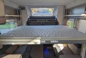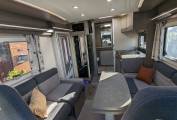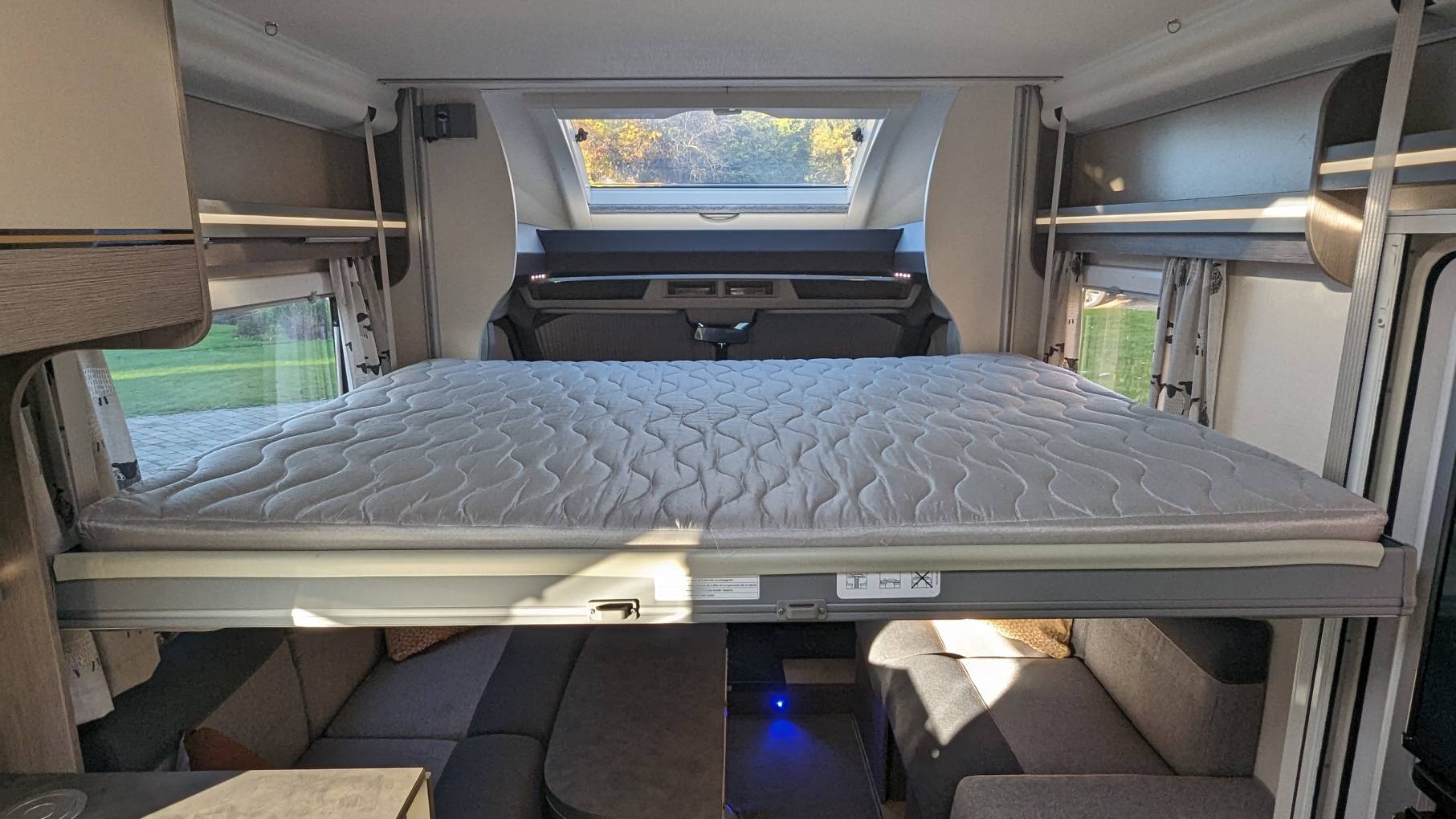 Now, let's venture into the cozy interior. A TV bracket is included (TV not provided), and the 4 Berth capacity accommodates a group of four. The Large Double Electric Drop-Down Bed promises a restful night's sleep, while the Double Make-Up Bench Bed provides additional sleeping space. Enjoy the view through the Large Openable Sunroof, and ensure privacy with Front and Middle Blackout Blinds and Curtains. Stay entertained with the Bluetooth Radio, and stay cool with A/C in the Cab. Set the mood with Interior Mood Lighting and gather around the Center Electric Dinette Table for dining or workspace.