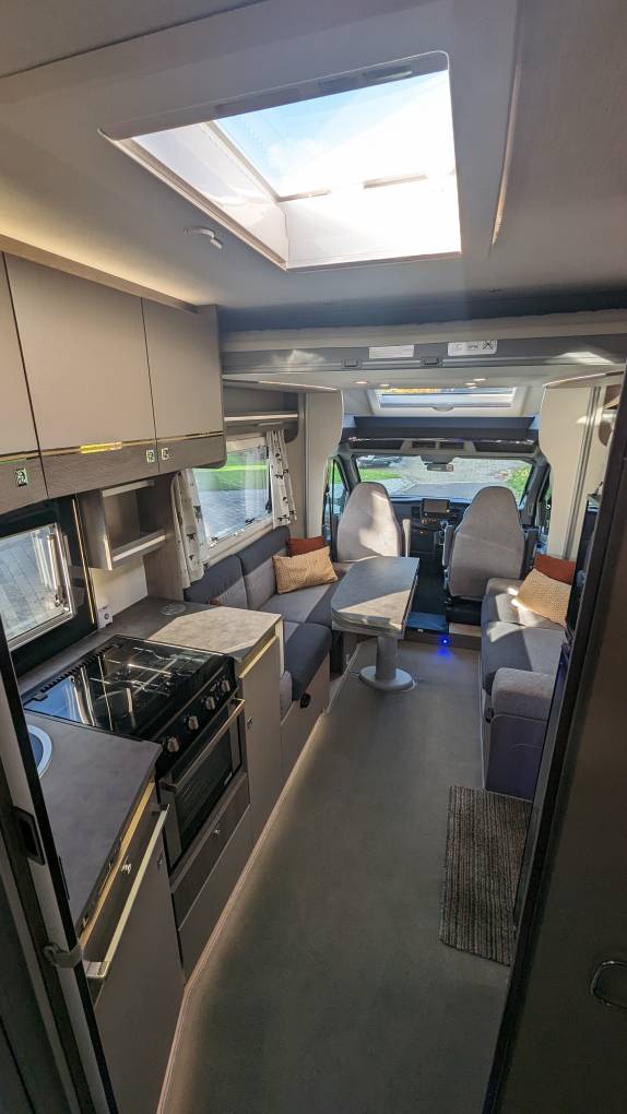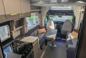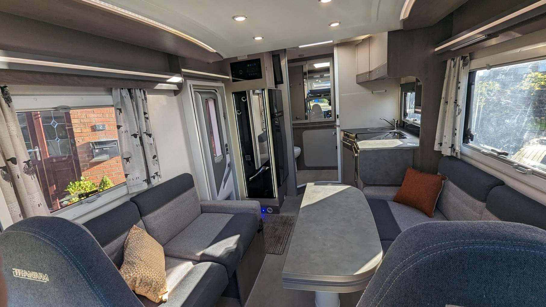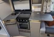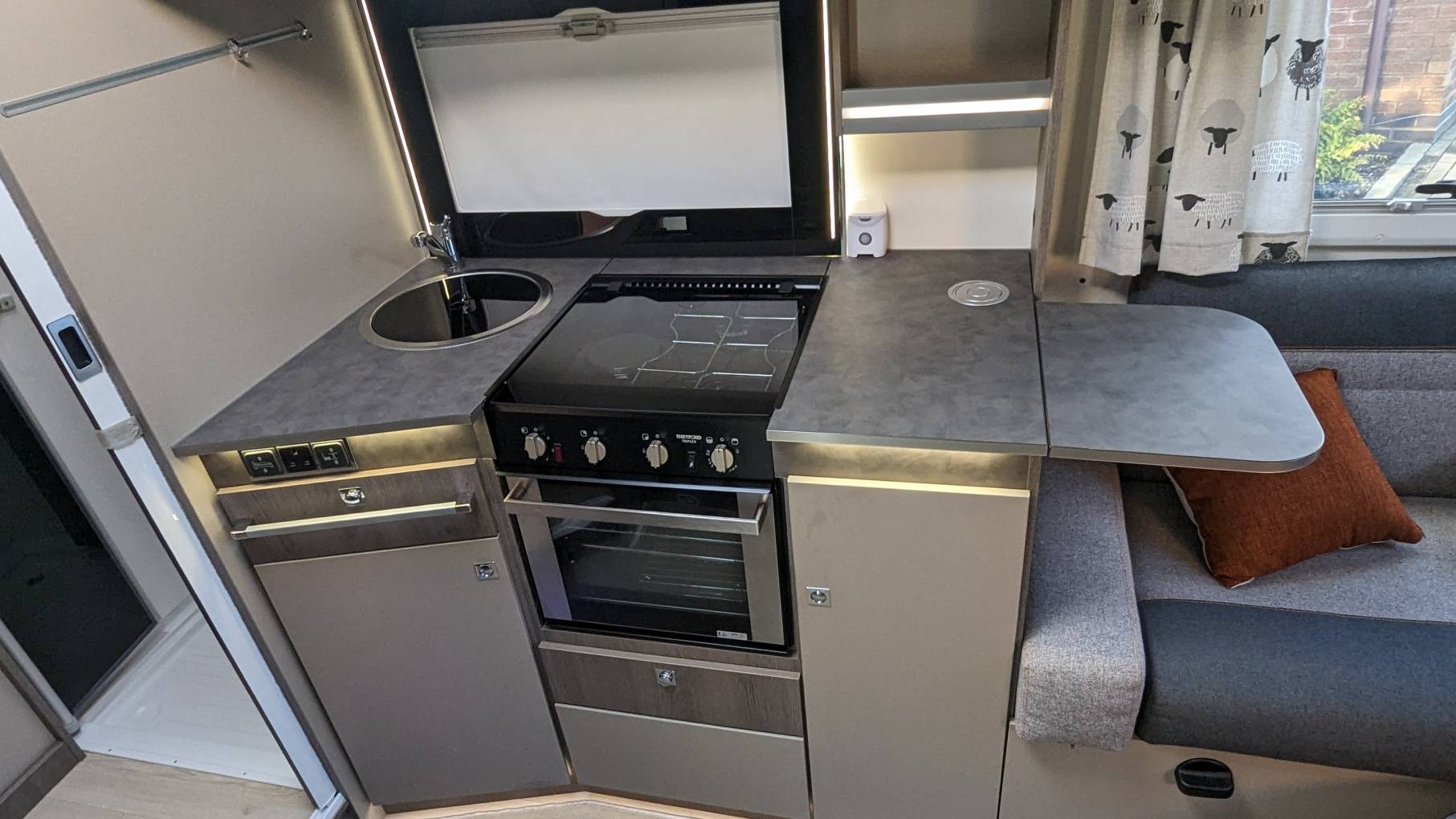 In the heart of the motorhome, explore the kitchen area. Ample Cupboard Space ensures you have all your kitchen essentials, and the 1 Electric Burner and 2 Gas Burners offer versatile cooking options. The Grill and Oven invite culinary adventures, and the Sink with Mixer Tap makes clean-ups a breeze. Pop-Up 3 x 3-Pin UK Plug Sockets and 2 x USB Ports cater to all your charging needs, and the Extra Pop-Up Kitchen Workspace adds convenience.