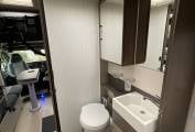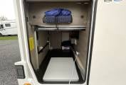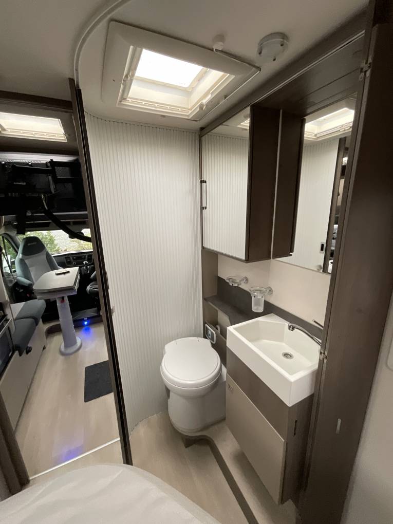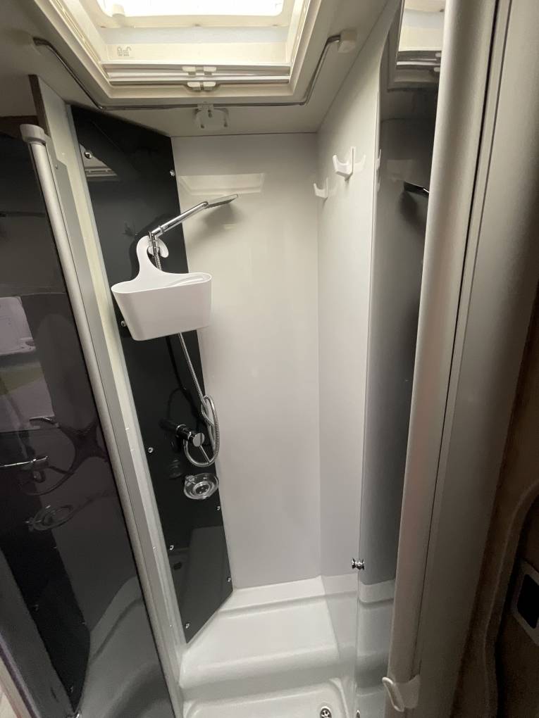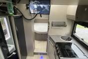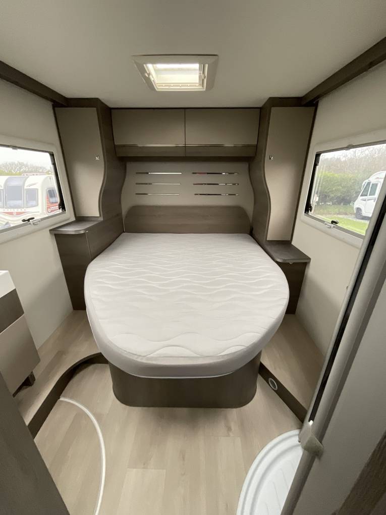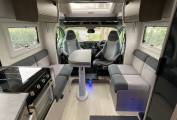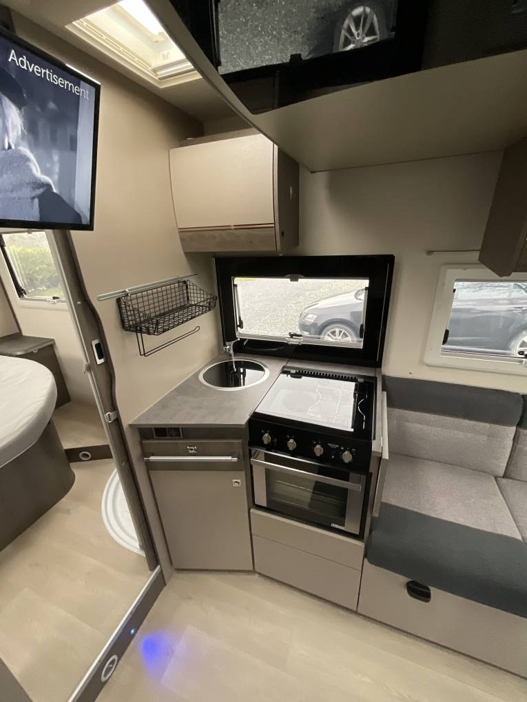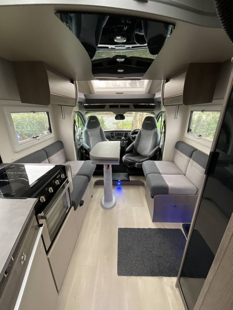 The living quarters are fitted with luxurious trimming and fittings and the panoramic skylights and abundance of LED lighting give it a light and airy interior. There is 12v and 230 volt throughout. The lounge/dining area has inward facing seats with an adjustable table. The sofas also have underneath them 2 forward facing, belted travel seats that can be folded up and out into position when required. Above the lounge is an electric drop-down bed, dimensions are 6’3” x 4’7”. The kitchen is equipped with cooker with a hob, oven and grill, a basin and 141litre fridge/freezer. The heating uses van diesel and not gas, so it can be used whilst driving so you arrive warm. The island bed in the rear measures 6’3” x 5’3” and sits over a very large rear garage, it is height adjustable to vary garage space. There is a separate shower room and a toilet/washroom on the opposite side of the motorhome. Outside there is a solar panel, 1no Propane gas bottle, Large rear garage with side and rear opening doors, Reversing camera and alloy wheels.