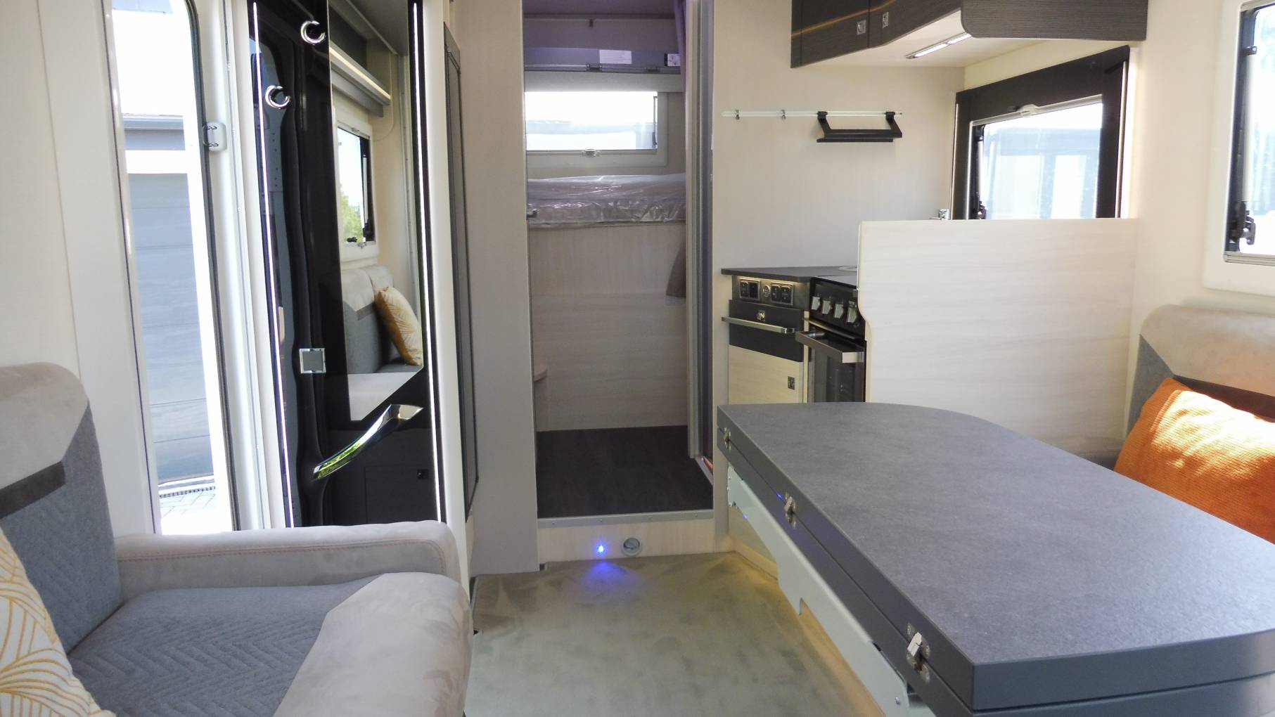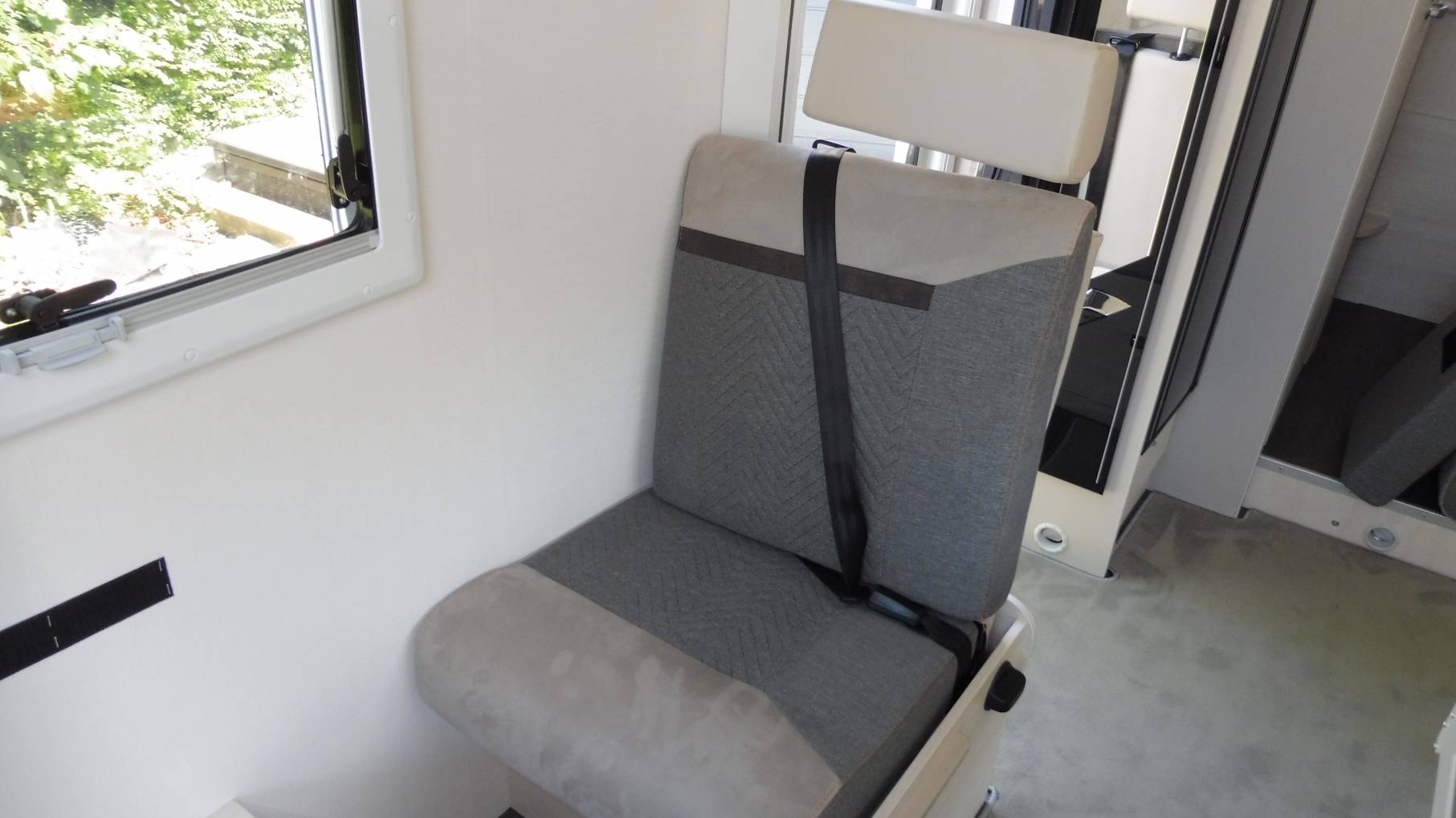 The lounge seating works around opposite sofas with height adjustable folding table. If you have additional travellers the pop-up seats allow for another two 3-point seat belts and an additional rear facing seat with lap-belt.