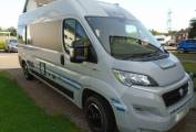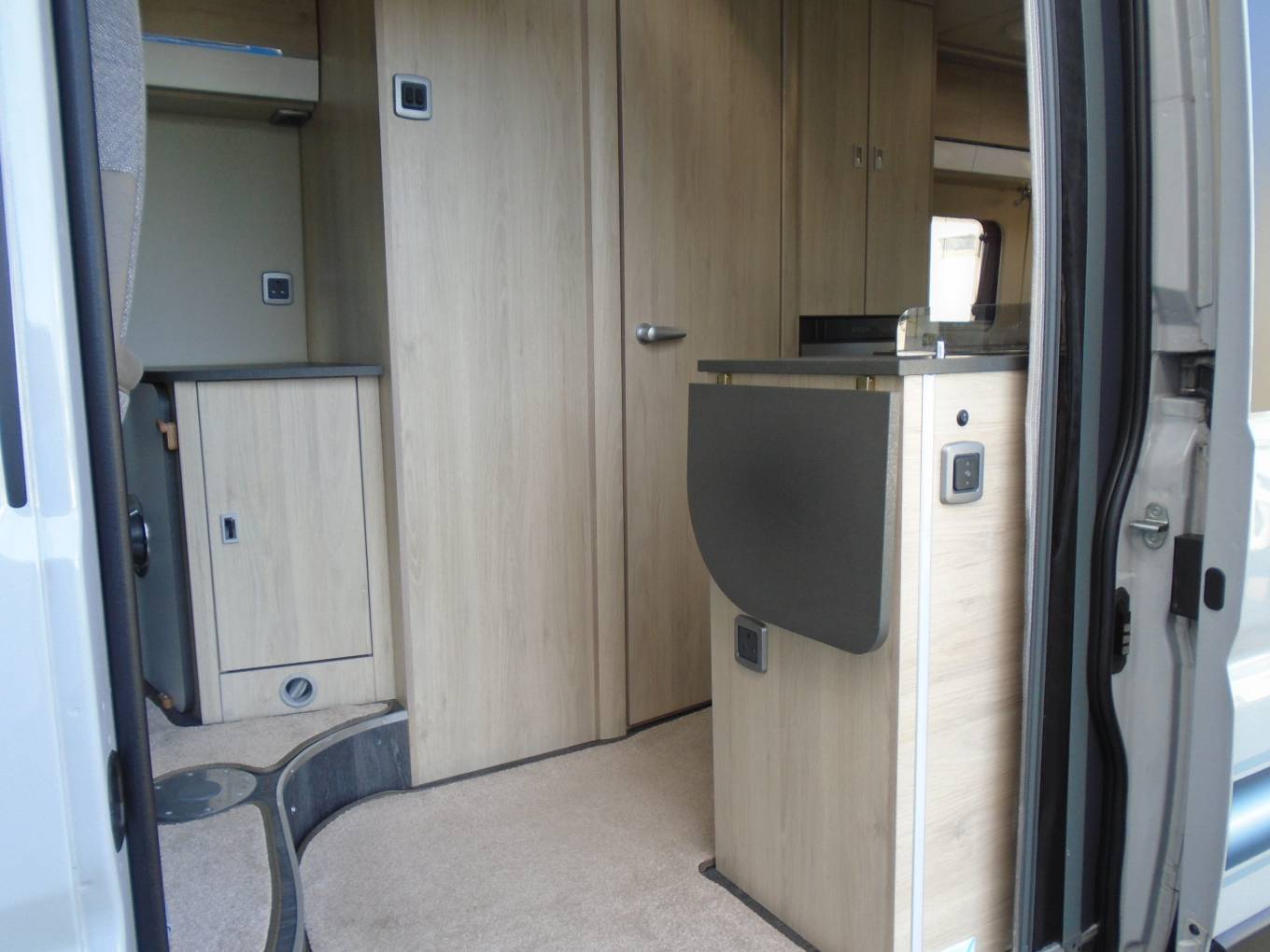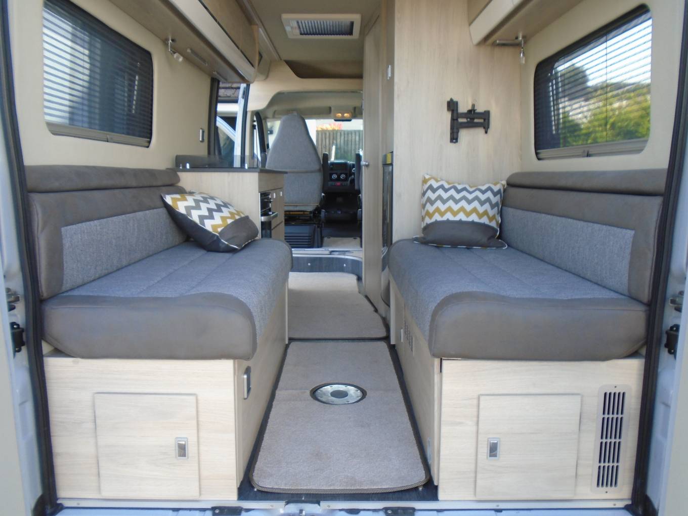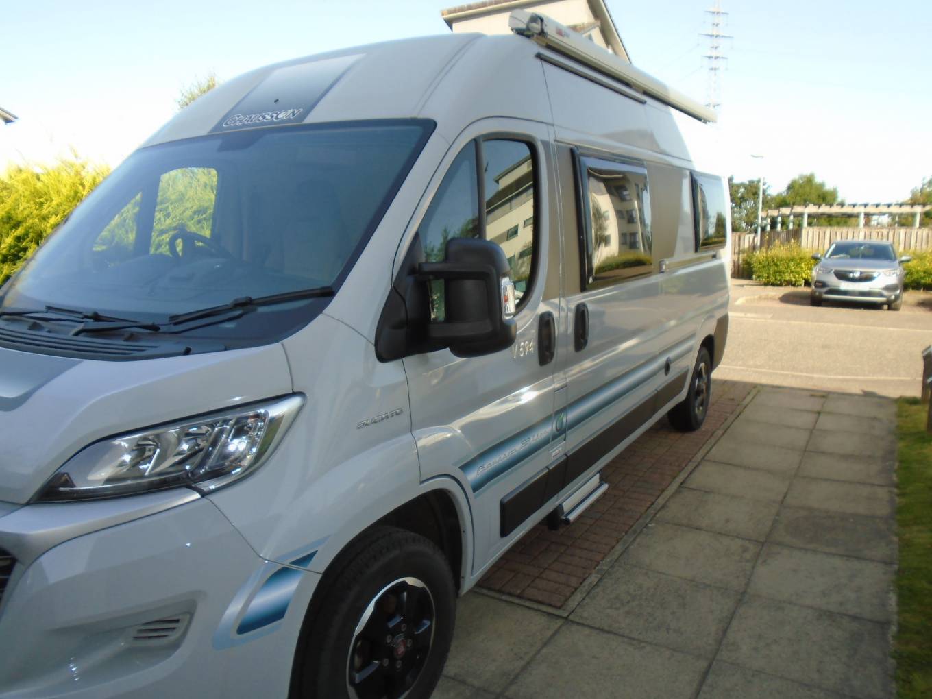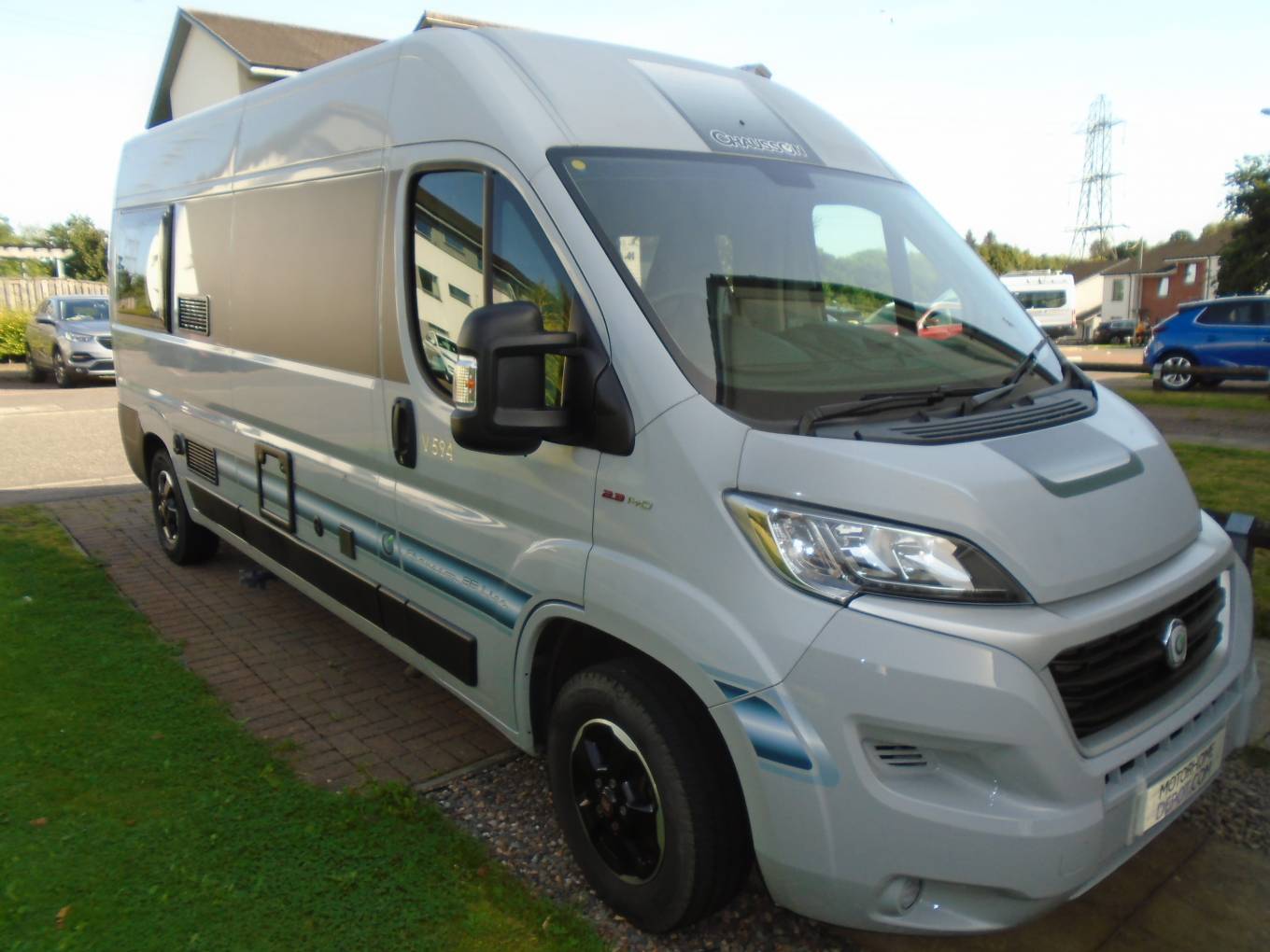 2020 Chausson V594 33 Line 2 berth compact camper for sale. Finished in Campovolo grey and based on the Fiat Ducato 3300kg chassis with an upgraded 140hp engine and 15″ alloy wheels. This end lounge configuration provides great comfort for 2 persons and transforms easily into a double transverse bed. Kitchen facilities are well catered for with hob, sink, oven, 3 way fridge freezer and ample storage cupboards. A compact yet spacious washroom has toilet, shower and basin. Other defining features include refillable gas, daytime running lights, bike rack, cab shades, awning, roof rails, solar panel, electric step, TV, onboard heating and hot water, onboard fresh and waste water tanks, twin swivel chairs, cab air conditioning and cruise control.
