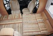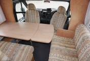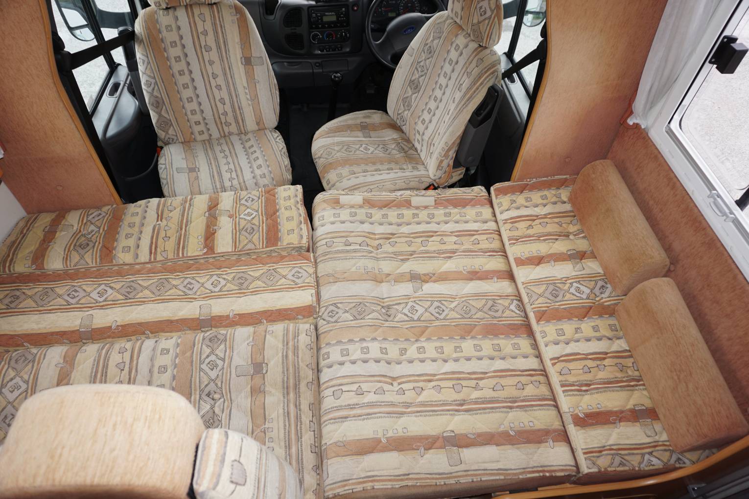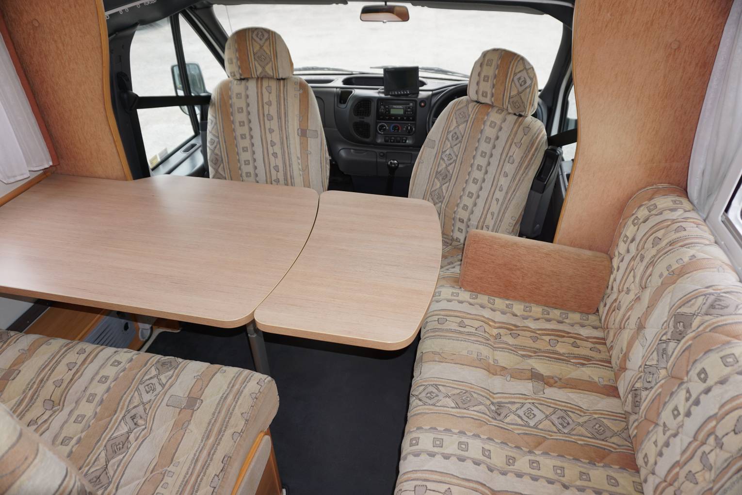 Large over cab bed to the front of the vehicle that can be easily lifted, on gas struts, out of the way foe easy access to the cab and swivel cab seats. These then accompany the forward facing belted seats and side bench to make the dining area for all the family. Extending table means no one is over reaching for the last slice of cake.