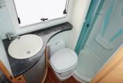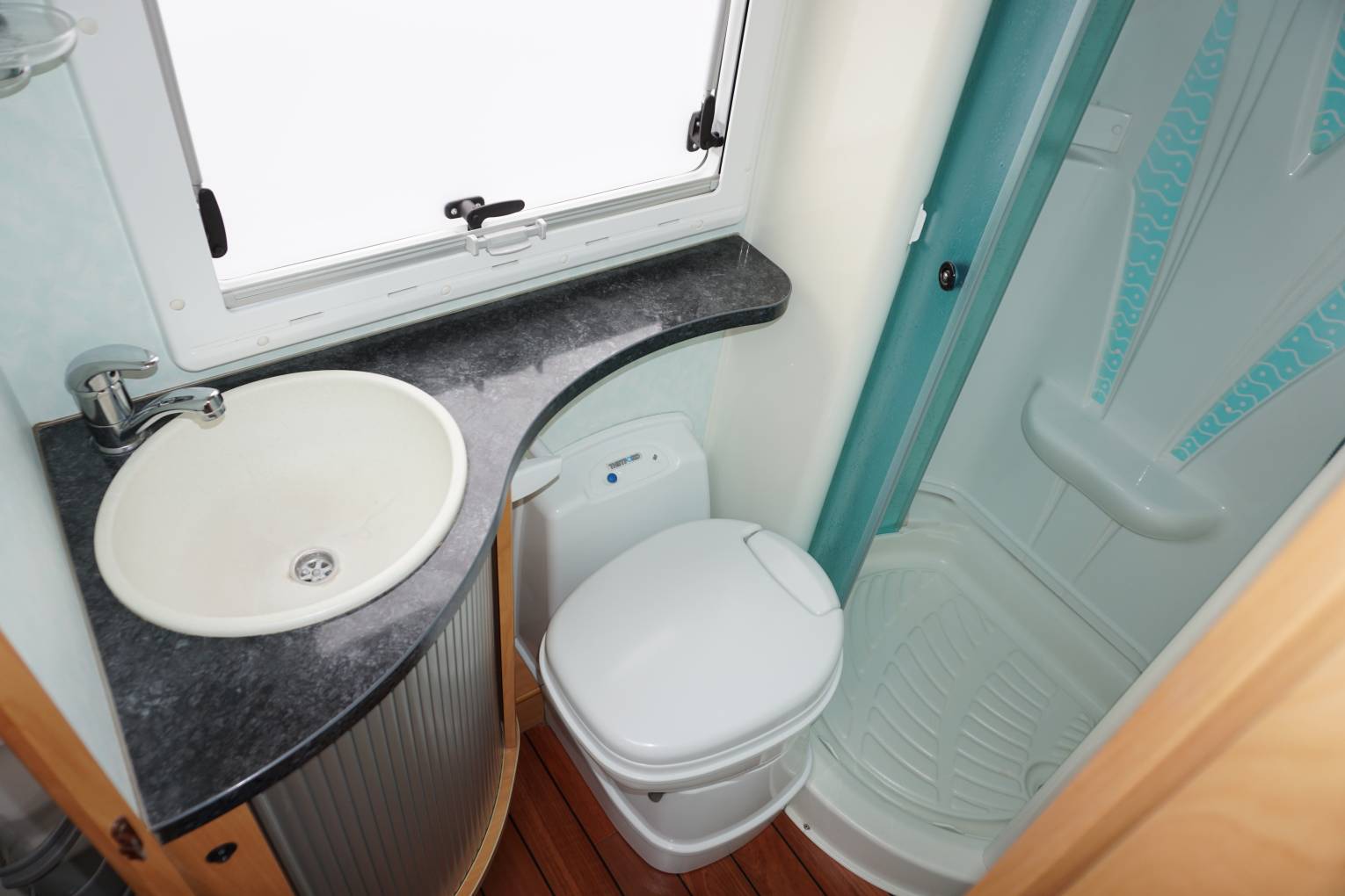 Behind the dinette is the well equipped kitchen with large fridge freezer, oven/grill, three burner hob and sink. Plenty of storage space for the posts and pans. Opposite the kitchen is the bathroom with Sink, storage cupboard, mirror, swivel toilet and separate shower with rotating screen door.