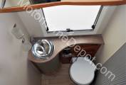Following on to the bedroom, on the left is the separate shower. The large double bed has a foldaway ladder. There is locker storage above and an entrance door below to the garage. Turning around, on the left is the washroom with sink and toilet