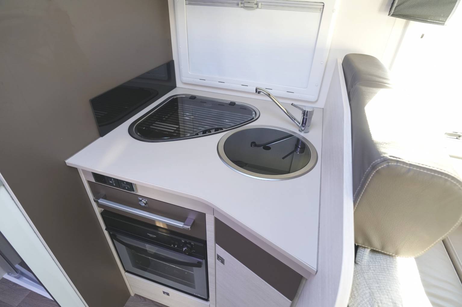 sink with mixer tap and large 3-way fridge / freezer opposite. At the rear of the motorhome you will find the large washroom complete
