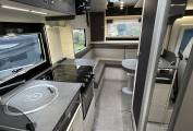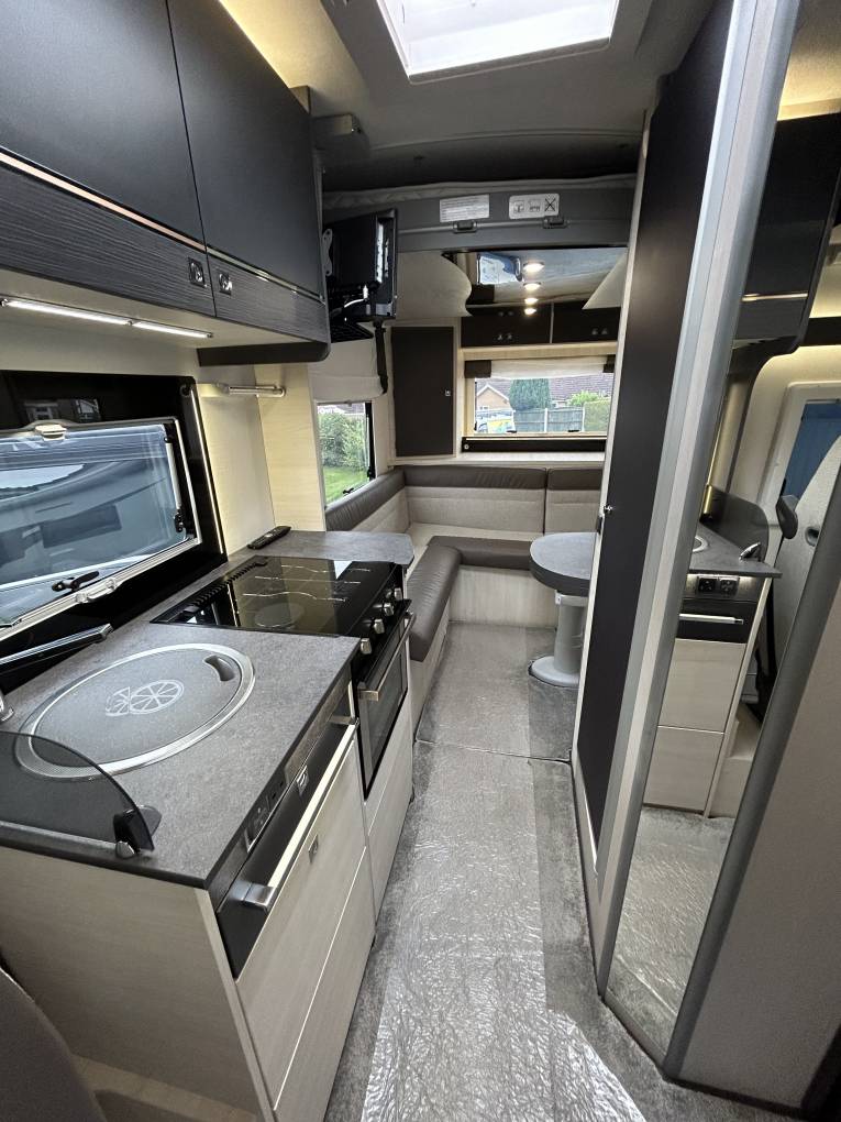 Just in front of the lounge area you will find the washroom which has everything you need including shower, fixed wash basin, toilet cassette, vanity mirror and more storage for toiletries.The kitchen area is mid habitation and includes a modern three way fridge with freezer space, sink with hot and cold mixer tap, two gas ring hob and an electric plate. Underneath this you have a combi oven and grill and there is ample of storage throughout both the lounge and kitchen areas to enable you have everything you need whilst you are away. You also benefit from the having two habitation doors that will allow extra ventilation.