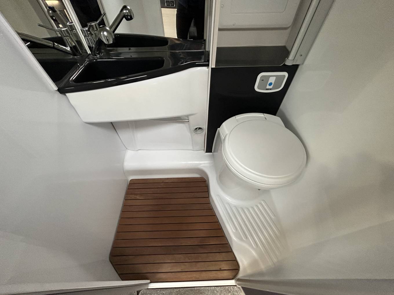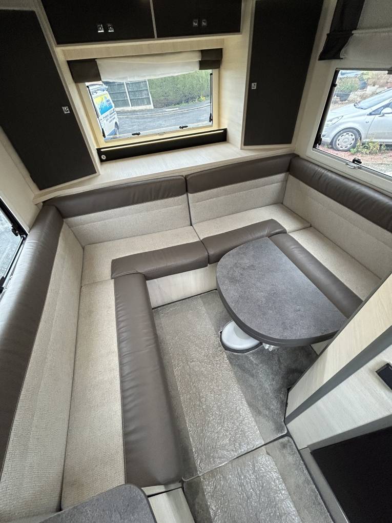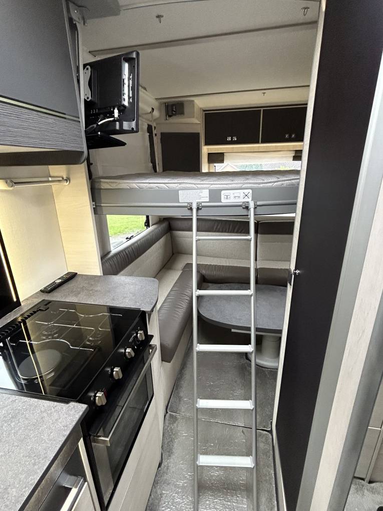 Starting at the rear you have a large U shaped lounge, that comes with a table in between that is adjustable via a touch of a button. The Rear Lounge surrounding windows will allow you to take in the views when you relax and unwind from a day of adventure and you have plenty of storage surrounding this area that is in next to new condition. Above this area you have the first of two electric large drop down beds and again is adjustable via a touch of a button which is a lovely touch.
