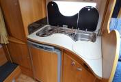 Starting at the rear, we have a large garage space which the height can be adjusted to accommodate different sized items within the garage space. The over garage bed is a good sized double and there are storage options within the lockers above. Moving into the L-shaped kitchen, we have a 3 burner gas hob, grill, handwash basin and a 3 way fridge. Adjacent to this, we have the washroom which includes a vanity style handwash basin, cassette toilet and shower enclosure. Into the lounge space, we have a dinette with 2 additional travelling seats and a side bench, the drivers and passengers seats swivel to provide ample seating for 5 people.