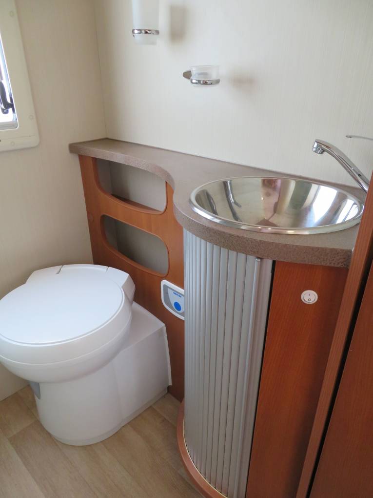 Swivel toilet, stainless bowl sink with storage under, vanity mirror over with sliding doored storage, separate shower, window, skylight.