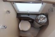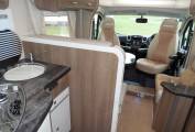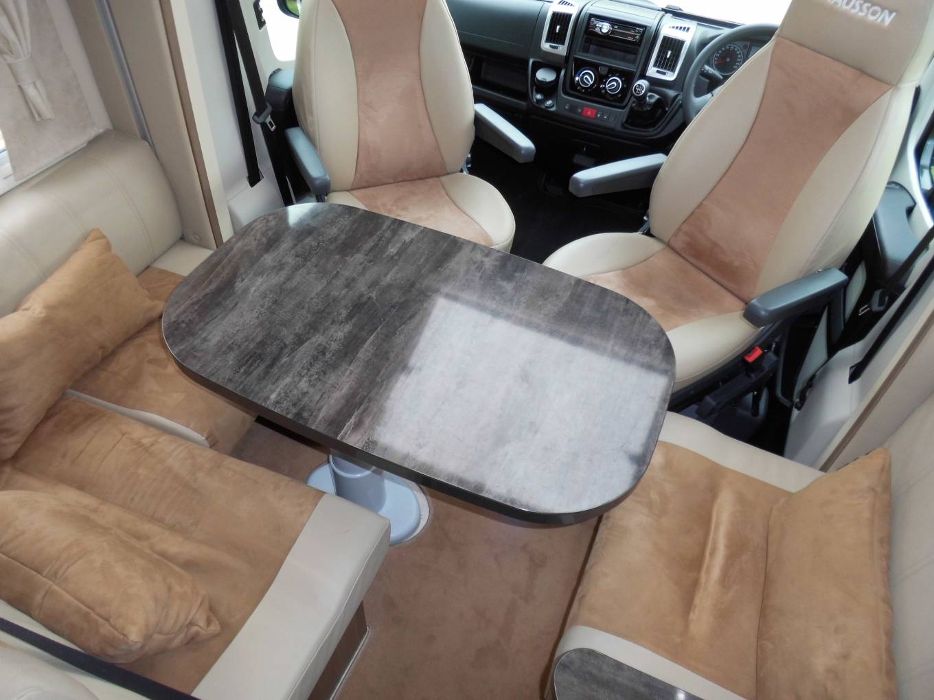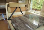 Above the dinette is the large transverse electrically operated drop down double bed which offers additional comfortable sleeping options. The dinette itself has a luxurious feel with half leather, half Alcantara seating and a stone effect table, with an additional seat opposite and the two front swivelling captains seats giving space for up to six people to comfortably dine, socialise and relax.