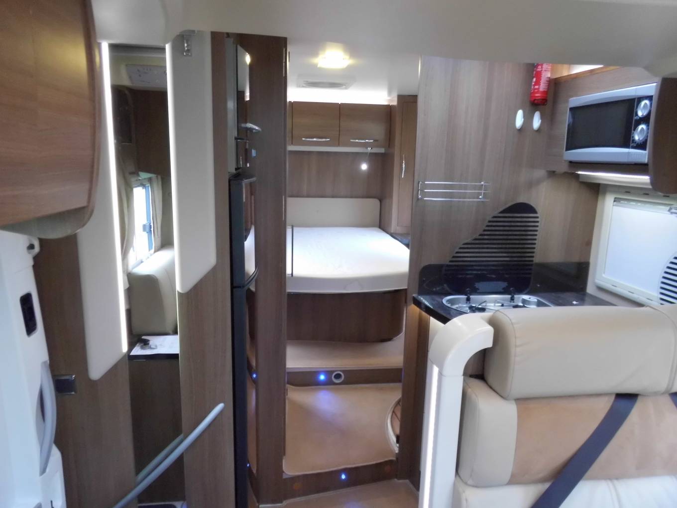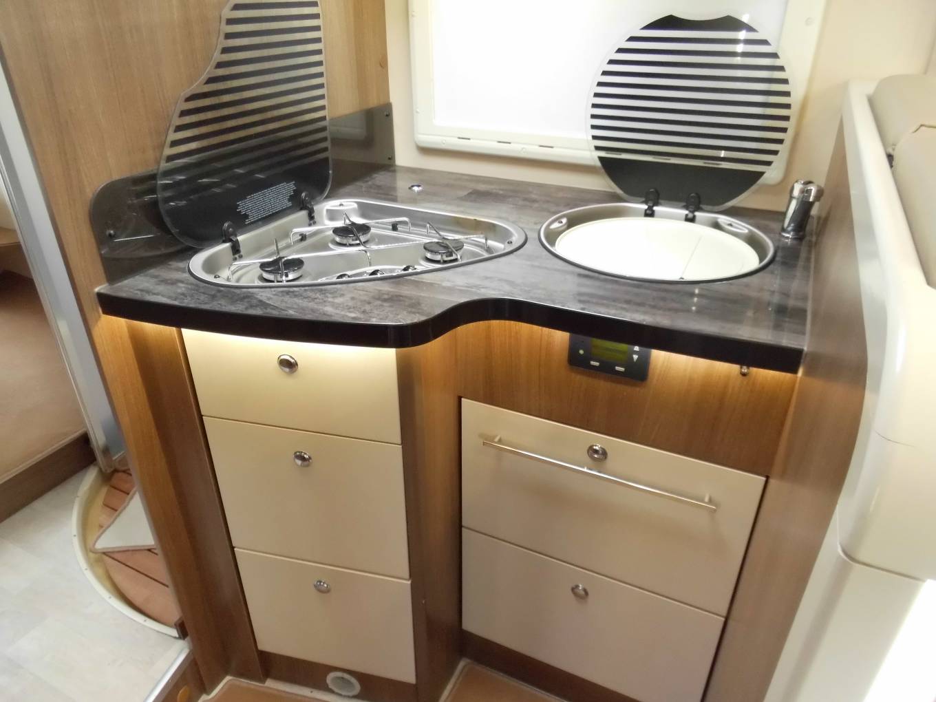 The modern and well appointed kitchen includes a Thetford three gas burner hob, grill, microwave, Dometic separate fridge and freezer and a circular stainless steel sink with mixer tap.