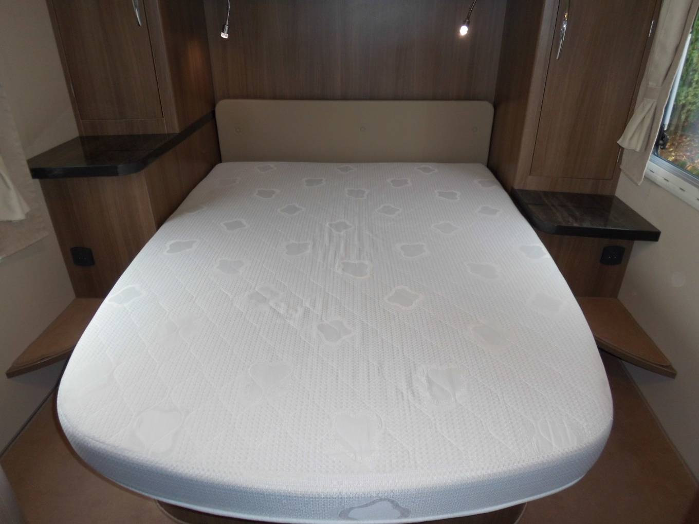 Inside, starts with the impressive island bed in the rear bedroom, giving people access to either side of the generous sized double bed, with wardrobe storage units and mains plug sockets on both sides and individual reading lights above. Moving forwards is the wc toilet and vanity washbasin area which is across the hallway from the separate walk in shower cubicle, with wooden duck board flooring.