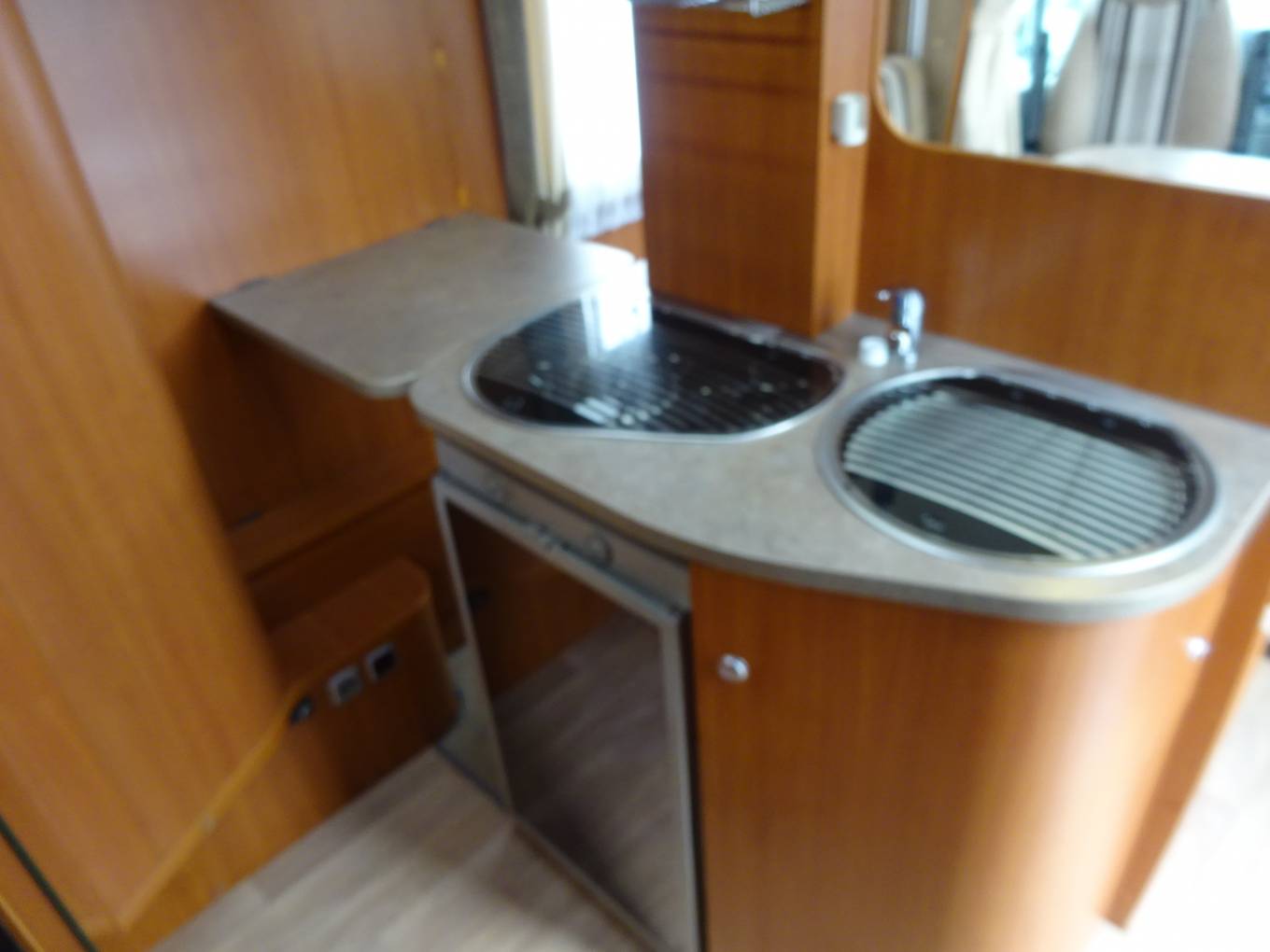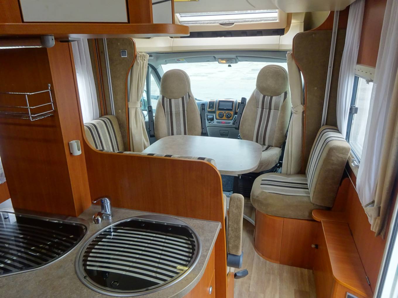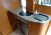 This amazing layout is like no other. The central lounge can seat six around a table. There is an island kitchen with hob, fridge and sink.