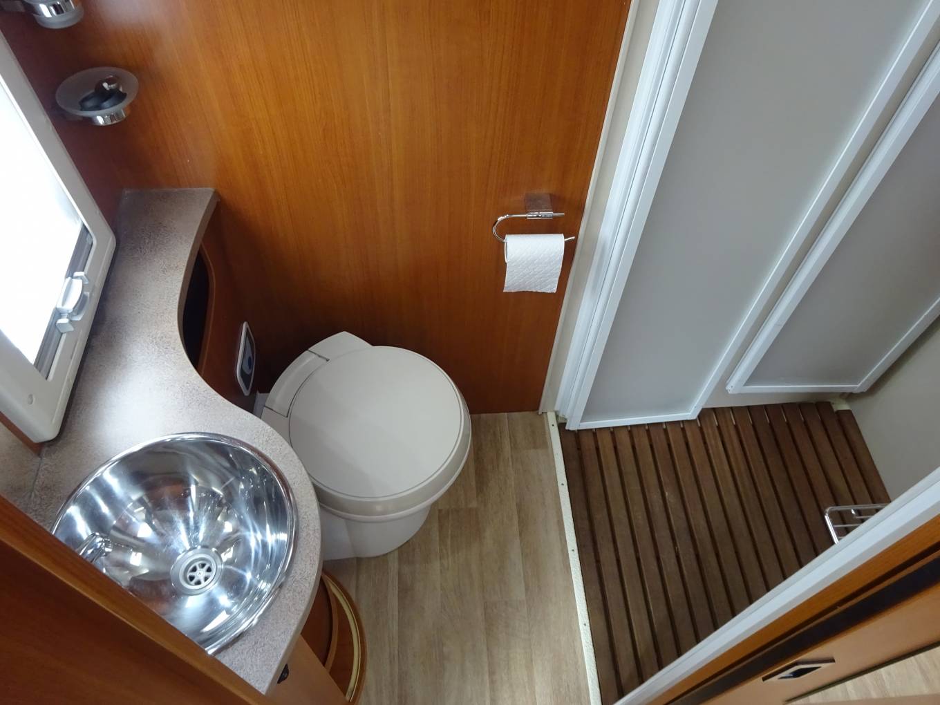 A large rear washroom with huge separate shower cubicle. Electric drop down bed which can be used at either mid height or low level.