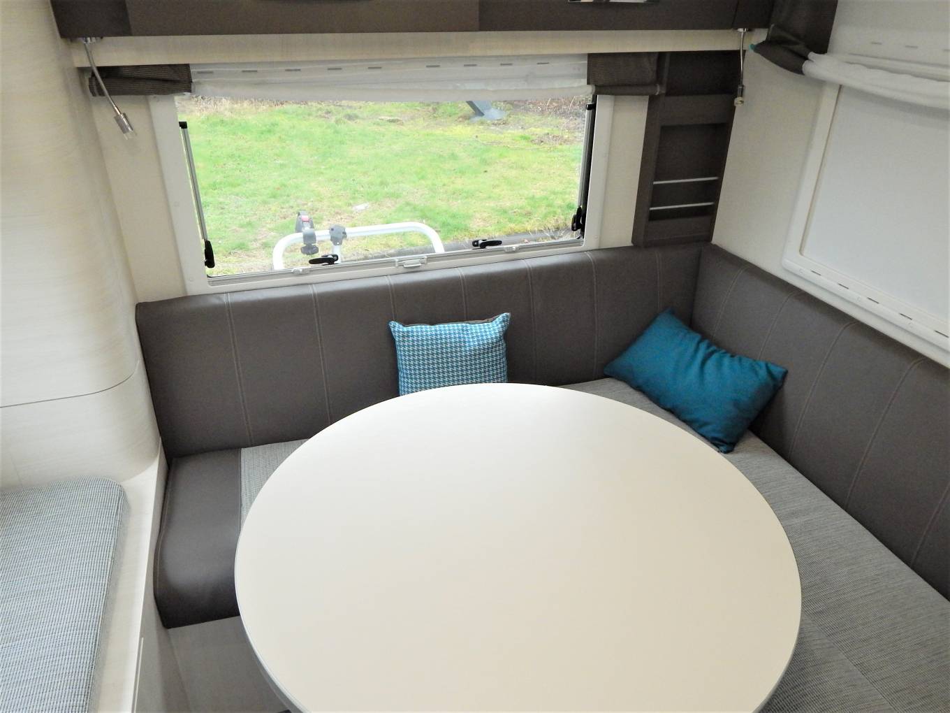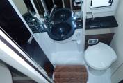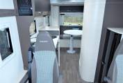 To the Rear is a large dual aspect rear lounge, with L shaped sofa and occasional window seat. There is a large circular dining table that can be moved in many axis to suit and will seat at least 6 if entertaining on site. The second of the electric drop down double beds is above this area. The table will electrically drop to the sofa level and then the bed can drop to meet the sofa. There are plenty of cupboards and a large hanging wardrobe.
