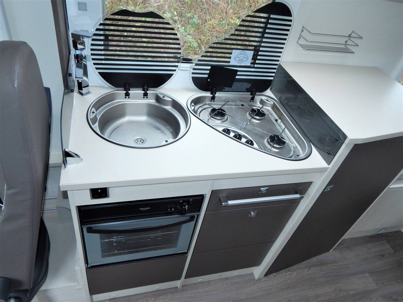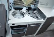in the middle of the motorhome is the Kitchen area which consists of a brushed metal single sink with chrome mixer tap and a 3 gas burner hob to the side. Underneath the counter is a large Thetford oven & grill with drawers to the side. Opposite is a large fully automatic absorber fridge freezer which can be powered by 240v, 12v or gas depending whether you are plugged in on site or wild camping.