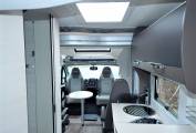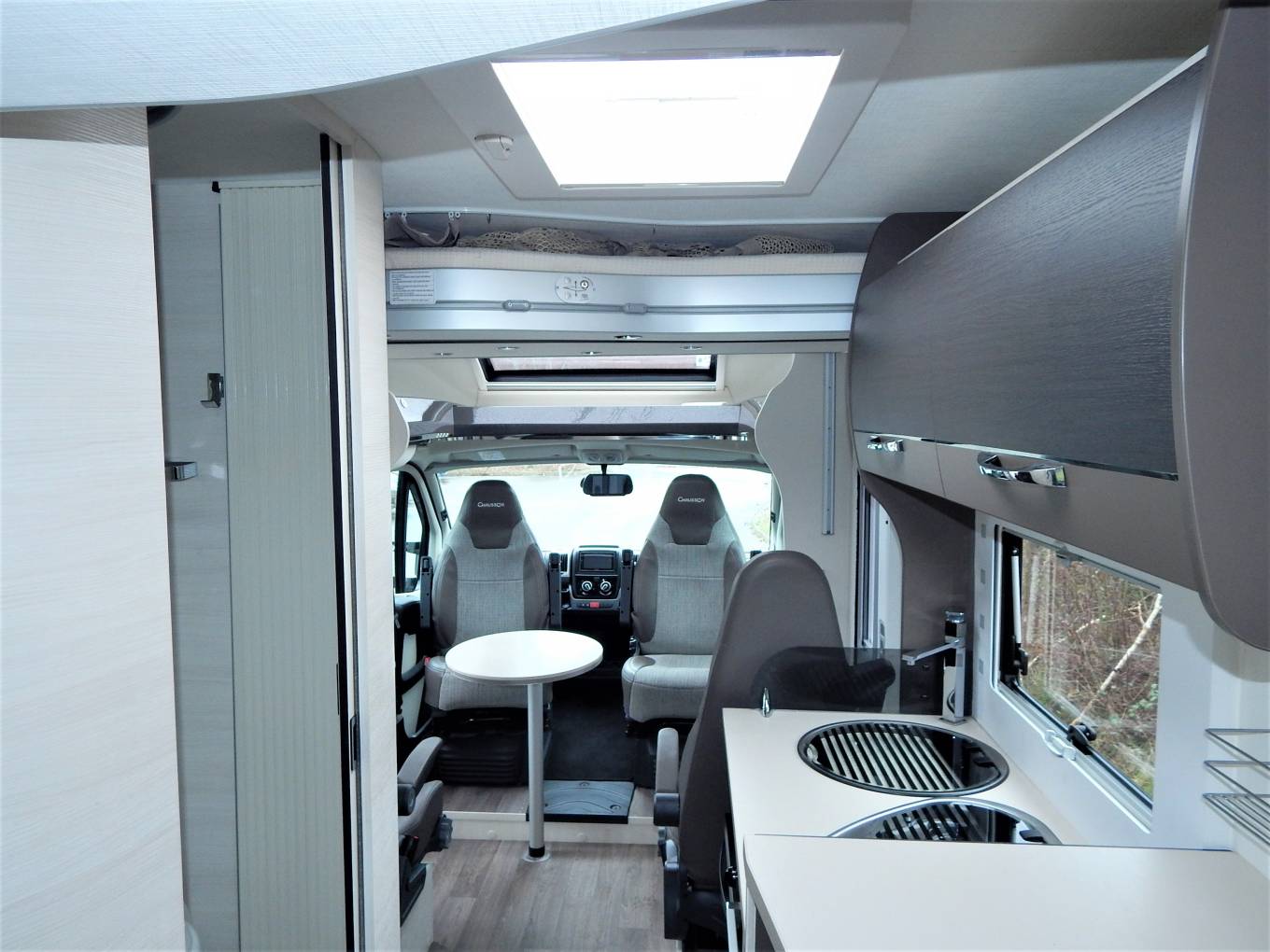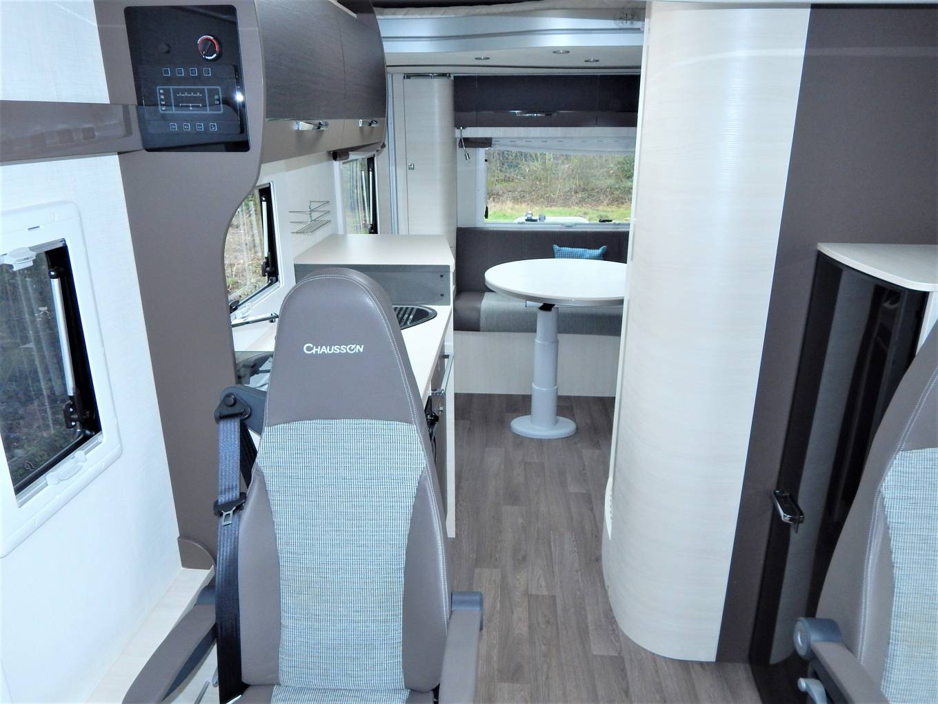 You can enter the Motorhome on either side of the habitation via a low step, we come straight in to the forward Lounge area with two forward facing travelling seats either side of the aisle, the drivers & passengers seats also swivel to join this area with an occasional coffee table that fixes in the middle, and stowed away to the near side while travelling.