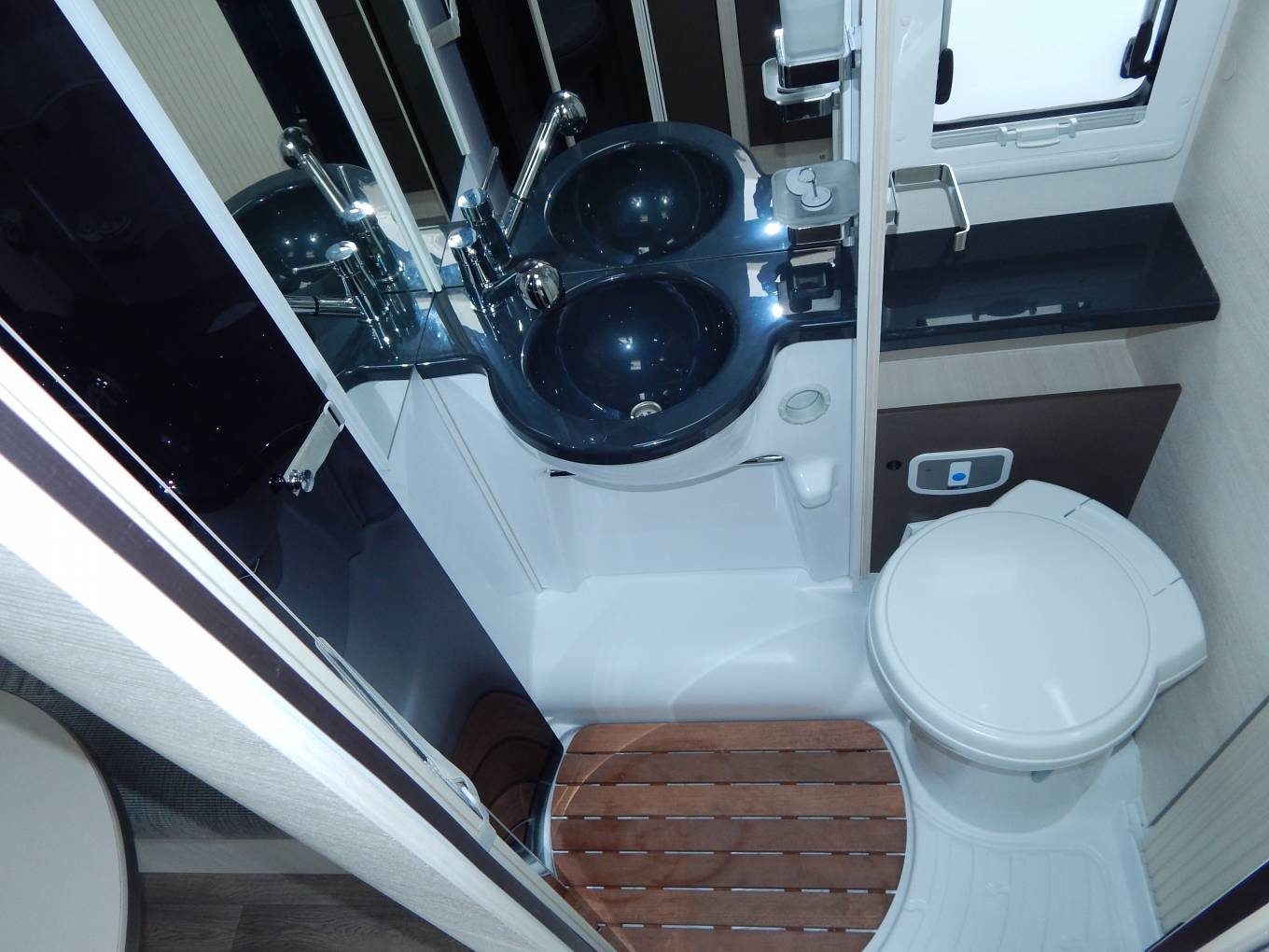 Moving rear the bathroom on the near side is an all in one affair with the shower separating via sliding perspex doors to keep the toilet dry while showering. again some clever design cues with the shower head converting from the sink mixer tap. The toilette a fresh water flushing Thetford Swivel head cassette unit.