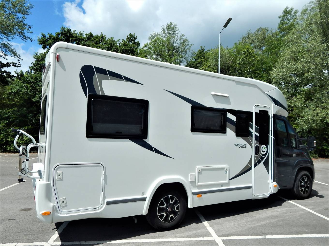 To the outside- Top 150W Solar panel; Rear 2 Bike rack, Drivers Side- Large garage door, electric hook up point, utilities locker for water and electrics. Near Side- Toilette Cassette locker, Single Bottle gas locker, small garage door.