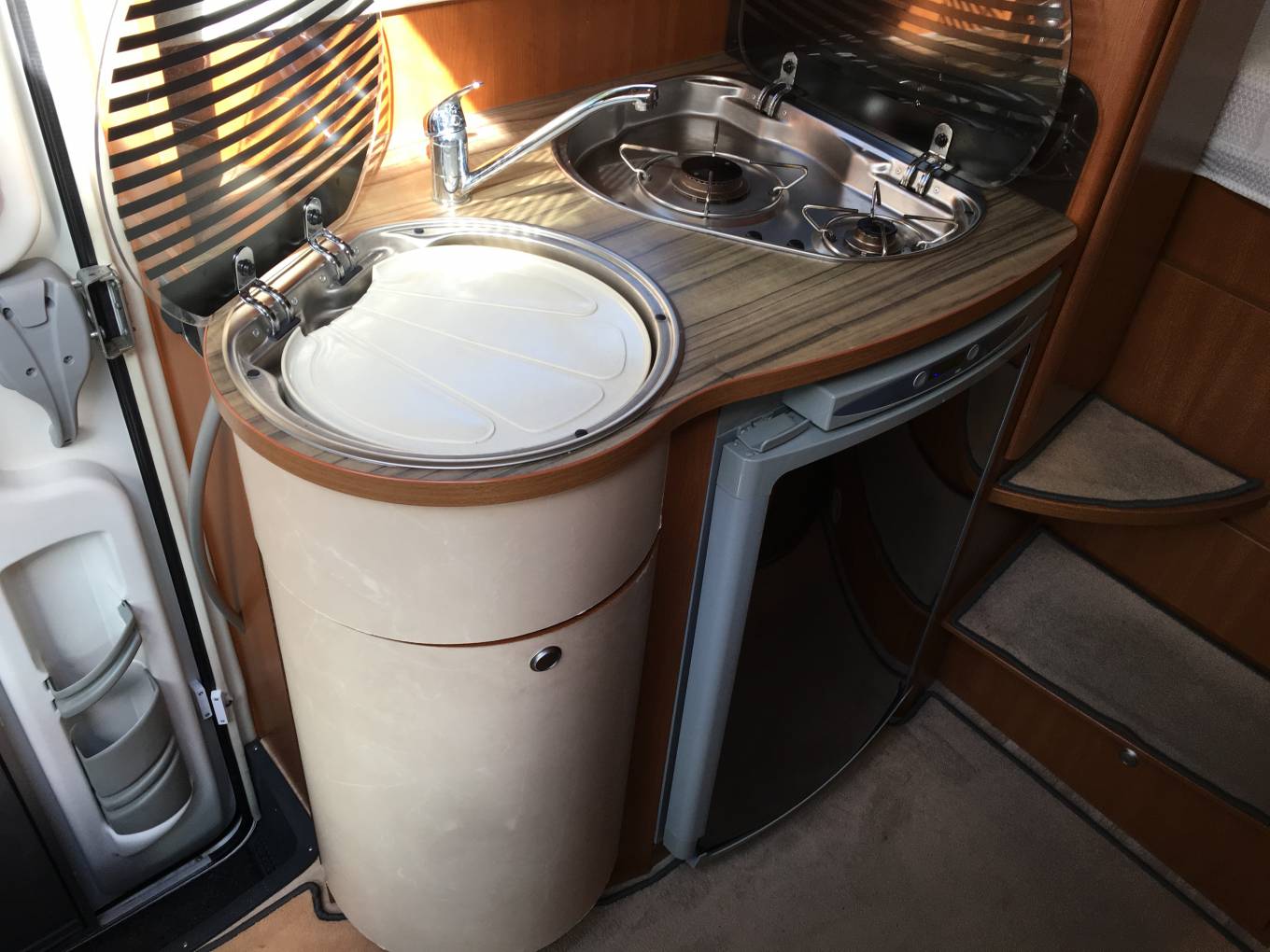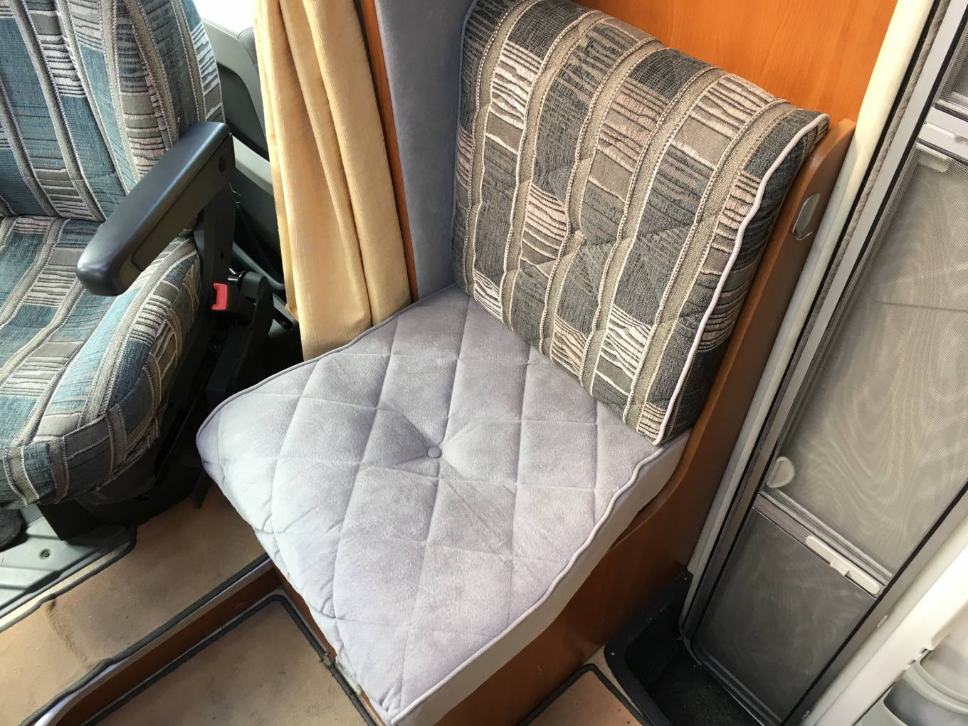 hinged door on the offside of the motorhome, a Fiamma awning, reverse parking