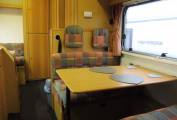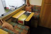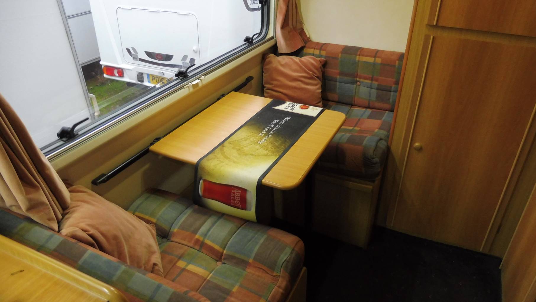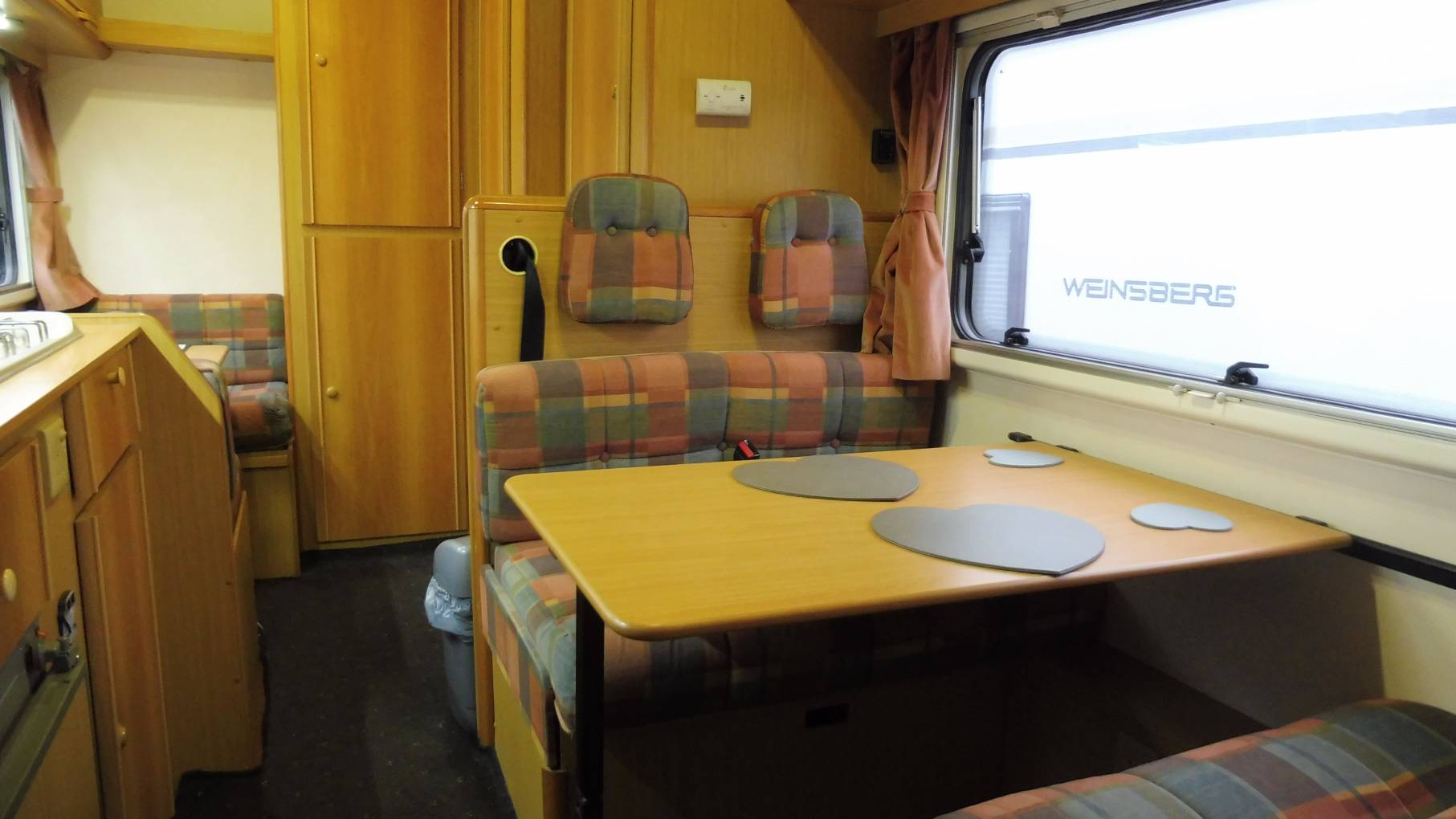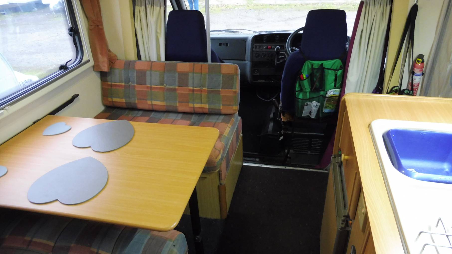 Entering the habitation door there is a 4-person dinette directly opposite. This has two additional seat belts so 4 people can travel in total.