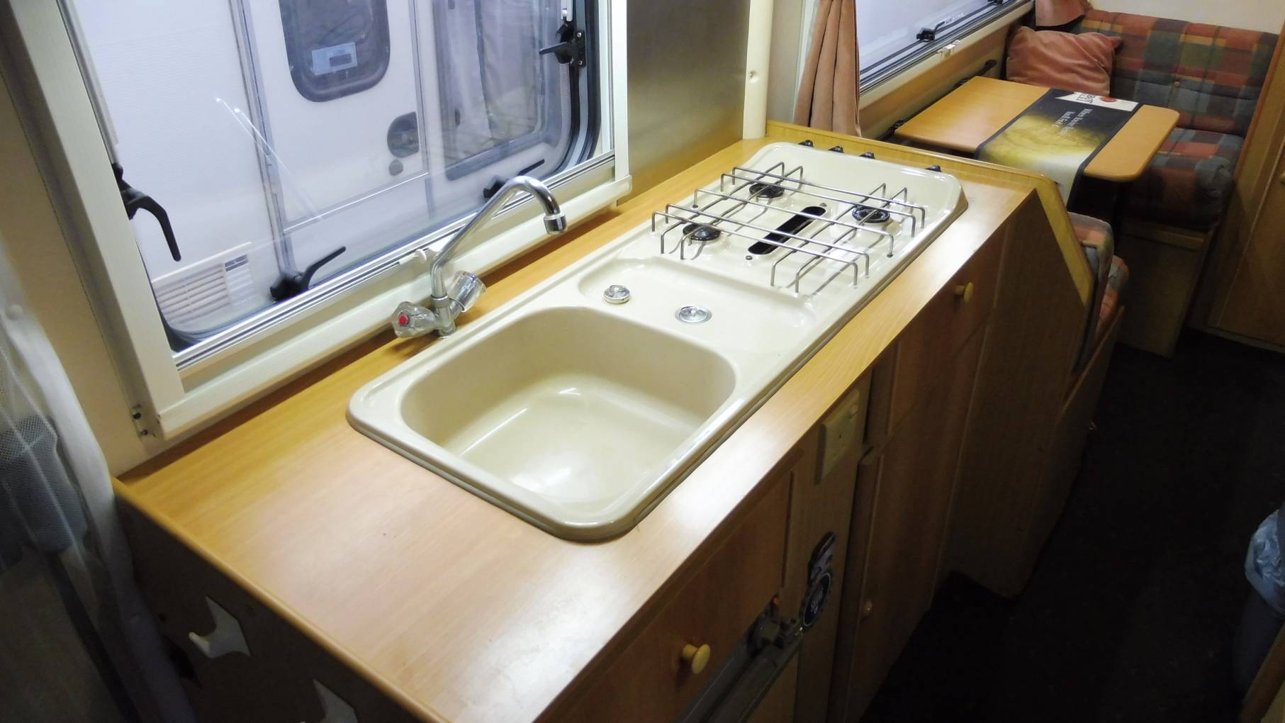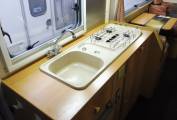 Turning toward the rear, the kitchen runs along the offside and comprises a 3-burner hob, sink and 3-way fridge.
